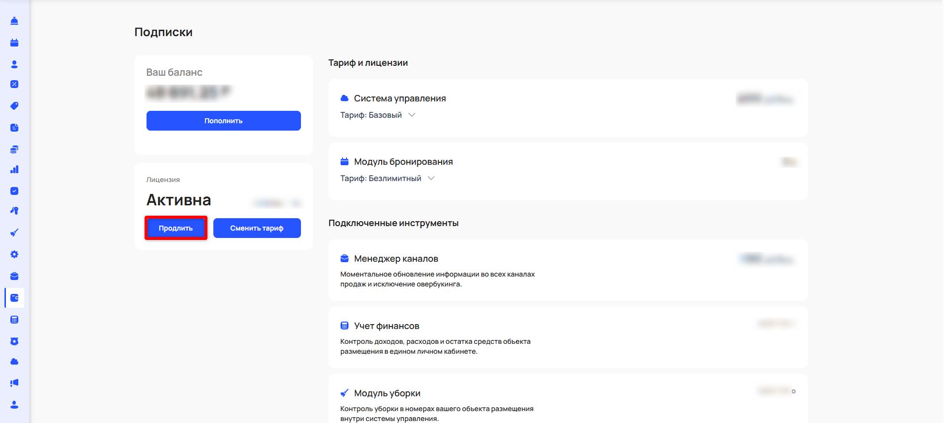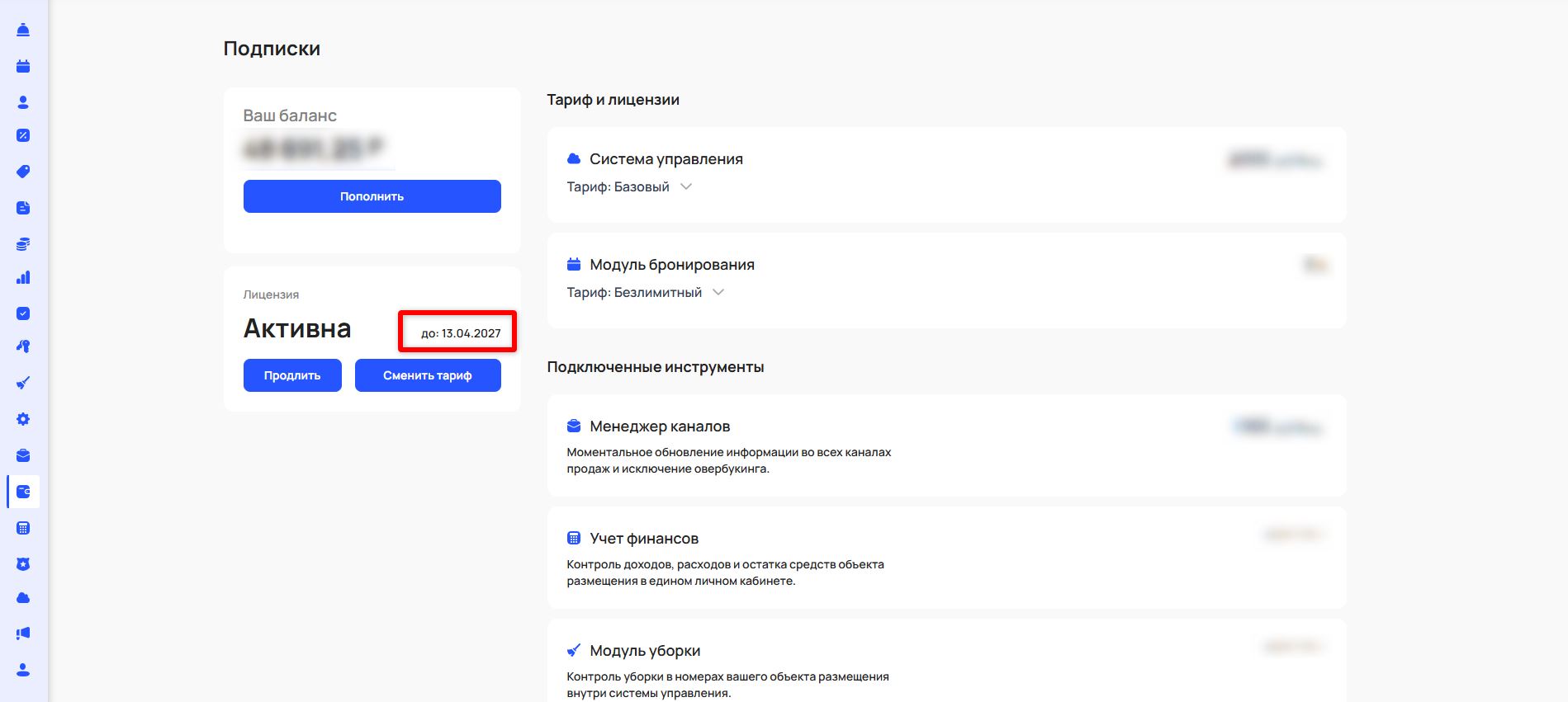 В блоке «Тариф и лицензии» отображается ваш текущий тариф на систему управления и модуль бронирования. По нажатию на стрелку раскрывается перечень услуг, входящих в тариф.