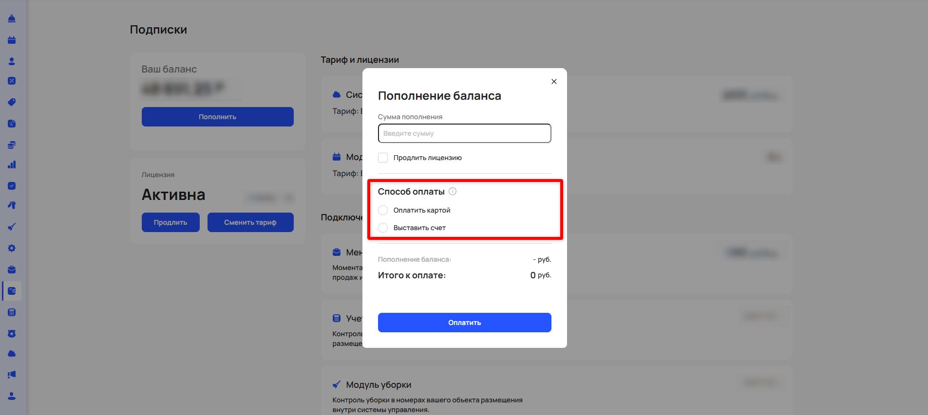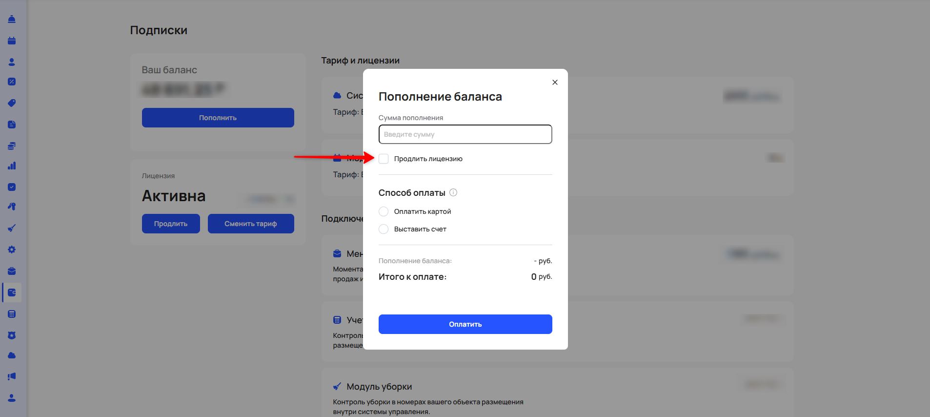 Пополнение баланса и продление лицензии