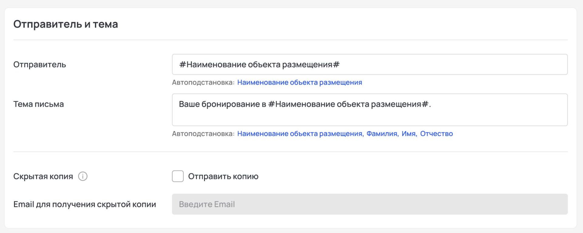 С помощью редактируемых полей вы можете настроить имя отправителя и тему письма, которые гость увидит в своей почте, а также отправку копий письма: