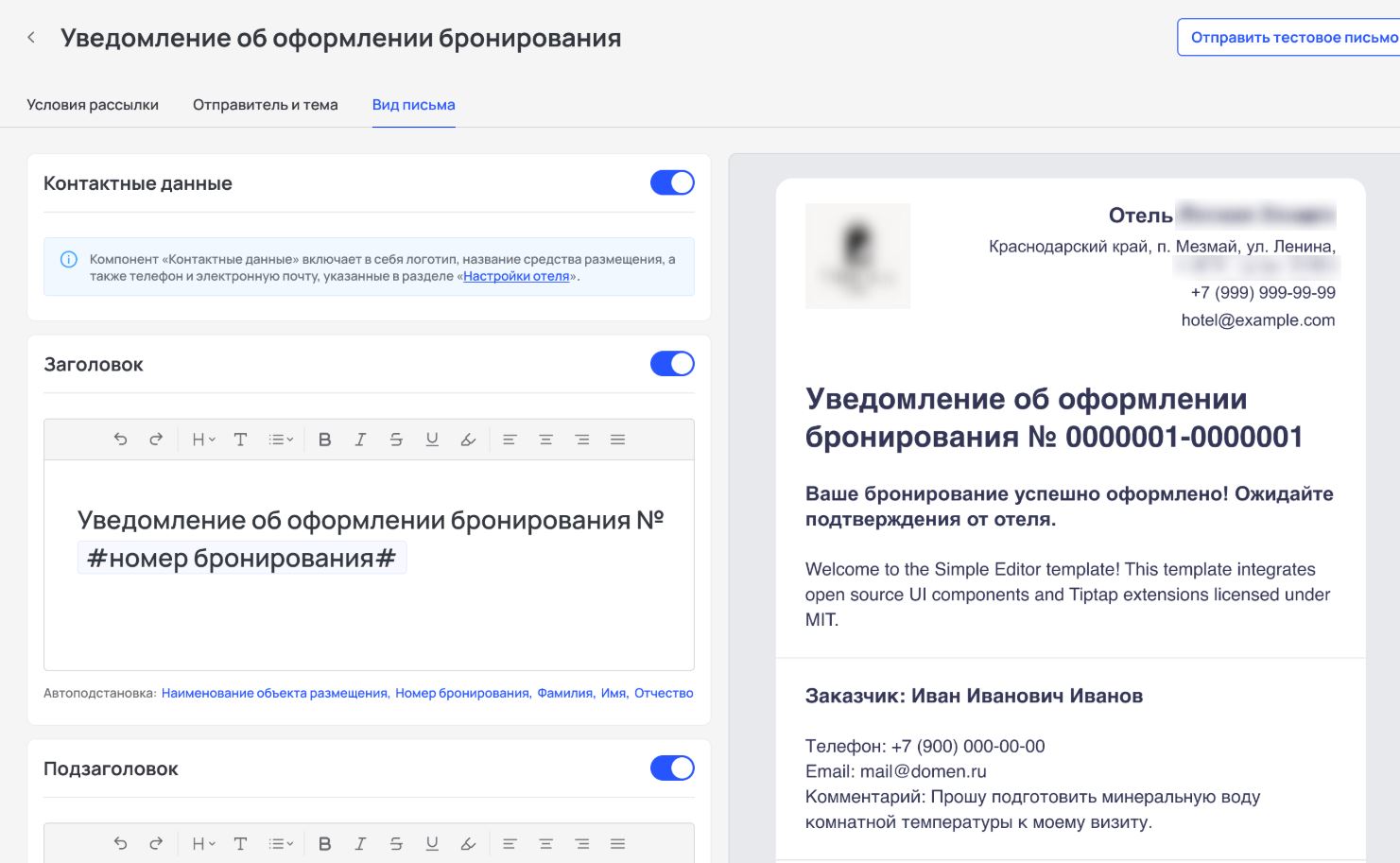 В левой части экрана вы собираете письмо из готовых блоков: добавляете текст, данные бронирования, контакты и другие элементы.
