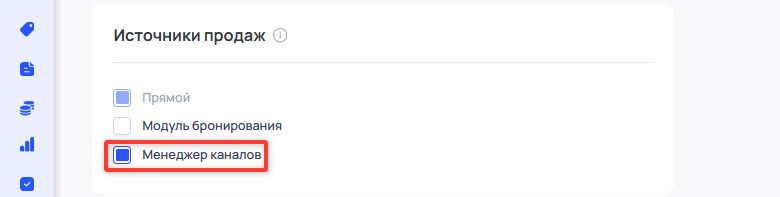 В настройках тарифа в блоке «Источники продаж» выберите пункт «Менеджер каналов», и снимите пометку с пункта «Модуль бронирования», чтобы тариф не был доступен гостям в модуле, но при этом передавался в канал продаж.