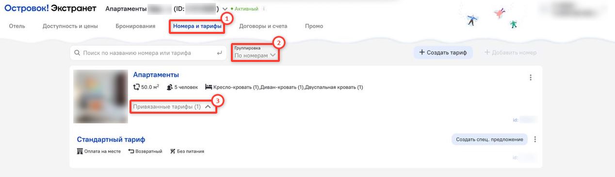 В экстранете «Островок!» перейдите в раздел «Номера и тарифы» и при группировке «По номерам» проверьте тарифы, привязанные к категориям номеров.