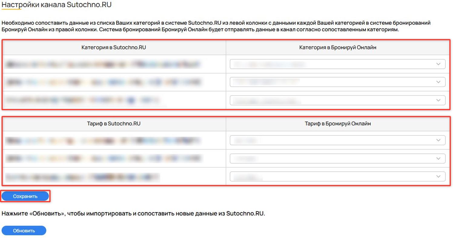 В открывшемся окне нужно сопоставить категории номеров и тарифы из канала продаж с данными в личном кабинете «Бронируй Онлайн» и нажмите кнопку «Сохранить».