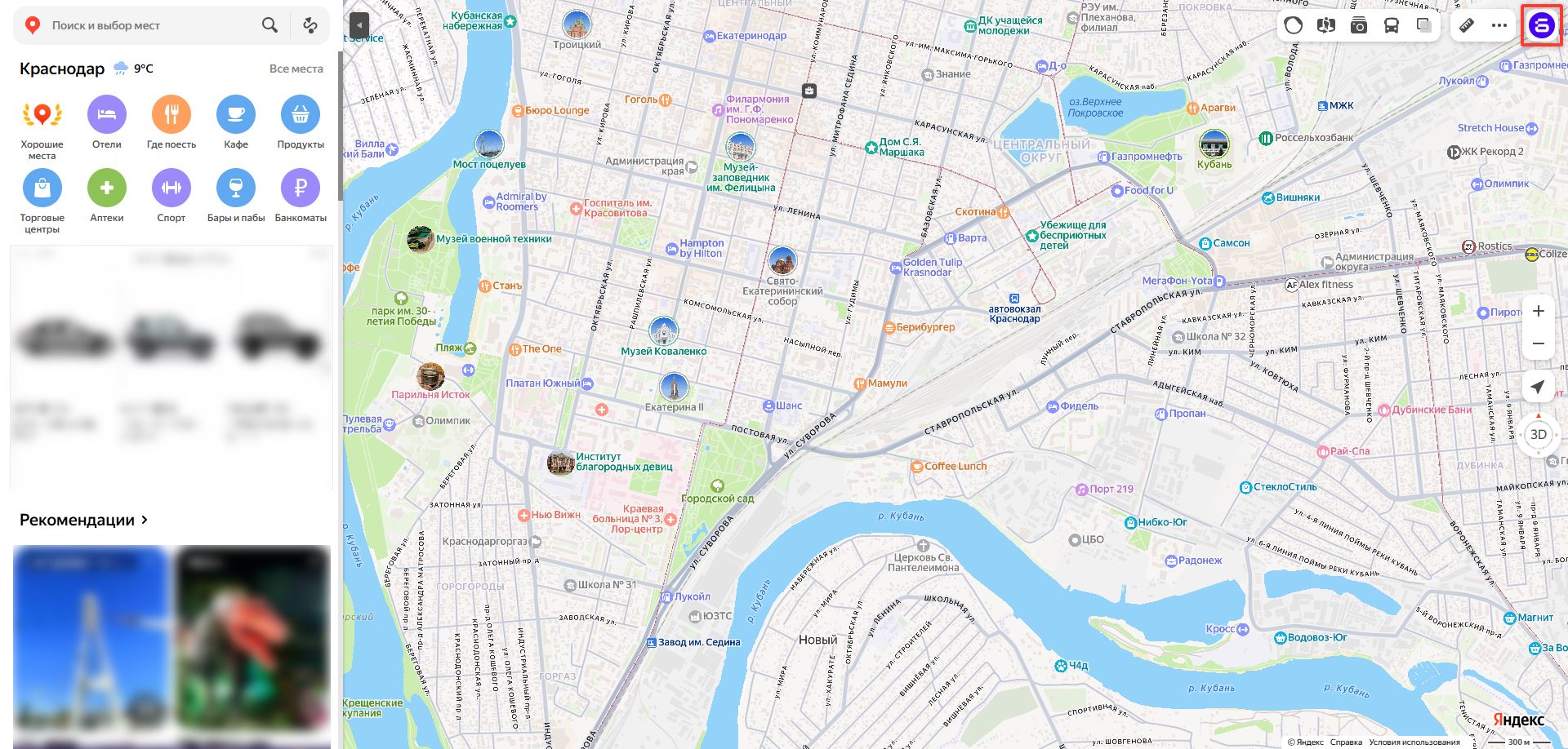 Зайдите в «Яндек Карты» и нажмите на иконку своего профиля справа сверху для открытия деталей профиля: