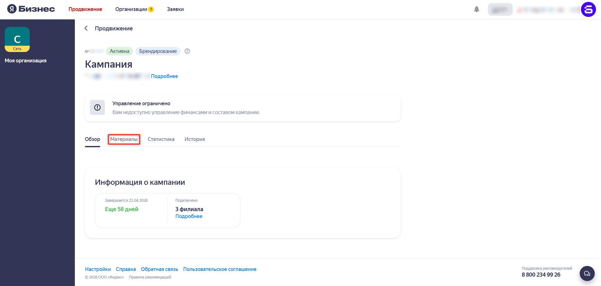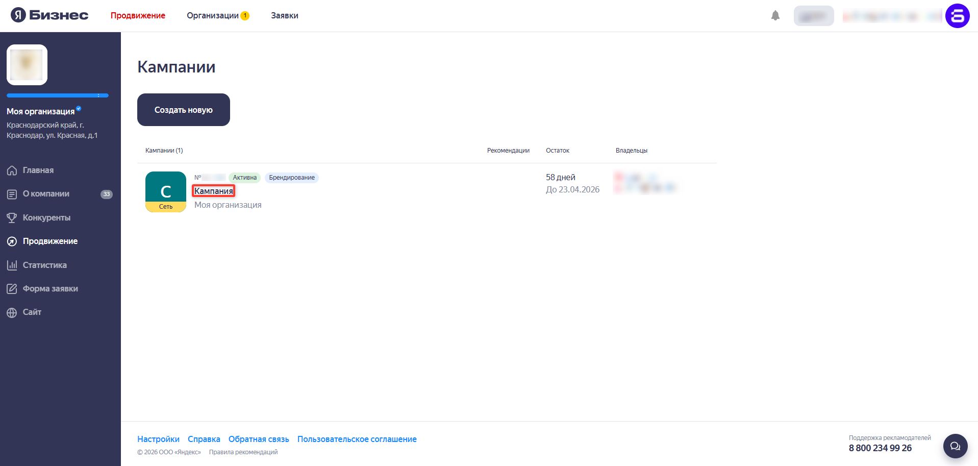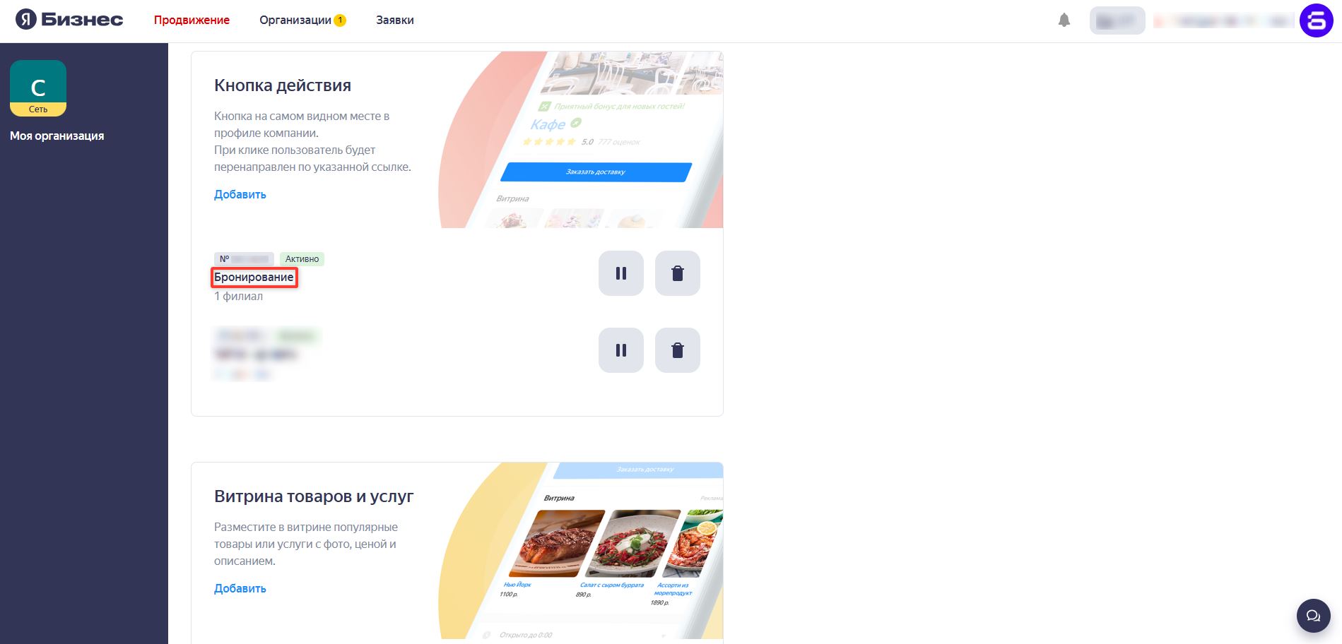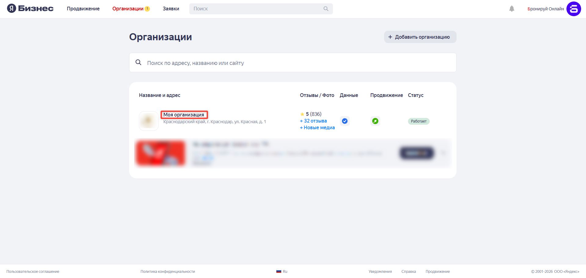 Нажмите на наименование организации, для которой необходимо настроить кнопку в «Яндекс Картах»: