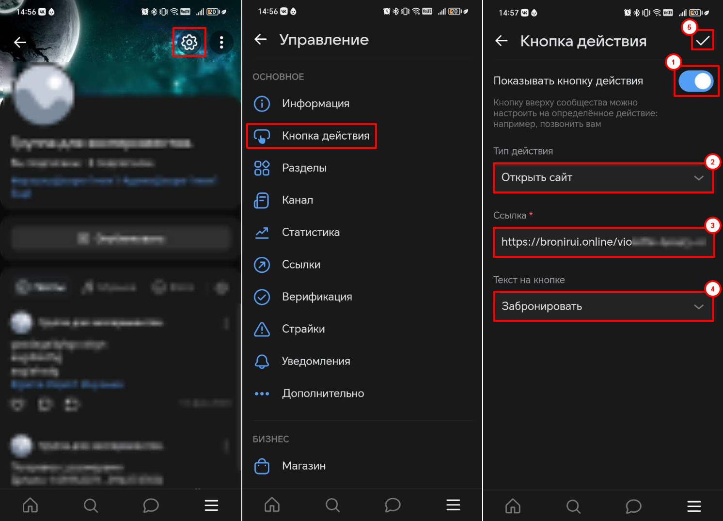 - В поле «Ссылка» укажите ссылку из личного кабинета «Бронируй Онлайн» из раздела «Модуль бронирования» (открыть в личной кабинете) в блоке «Установка модуля в соц. сети».