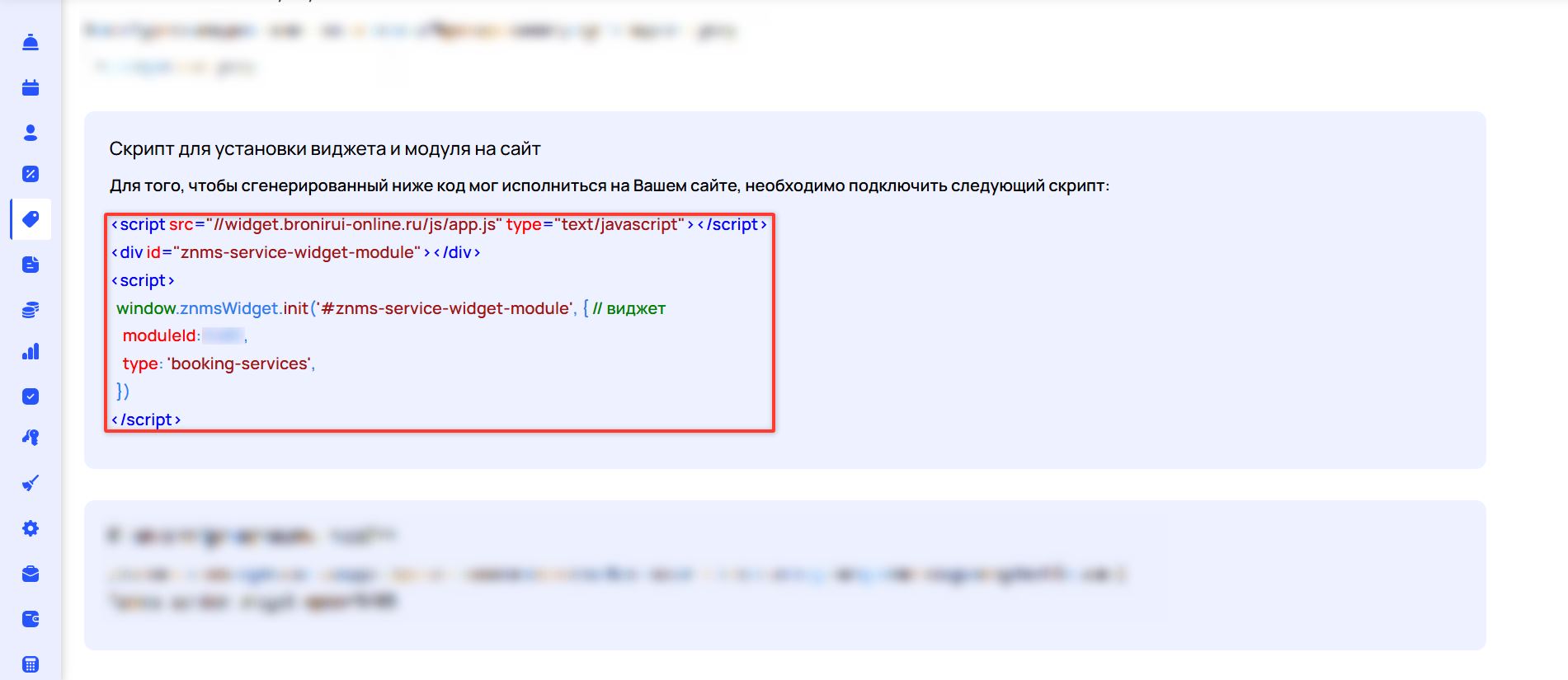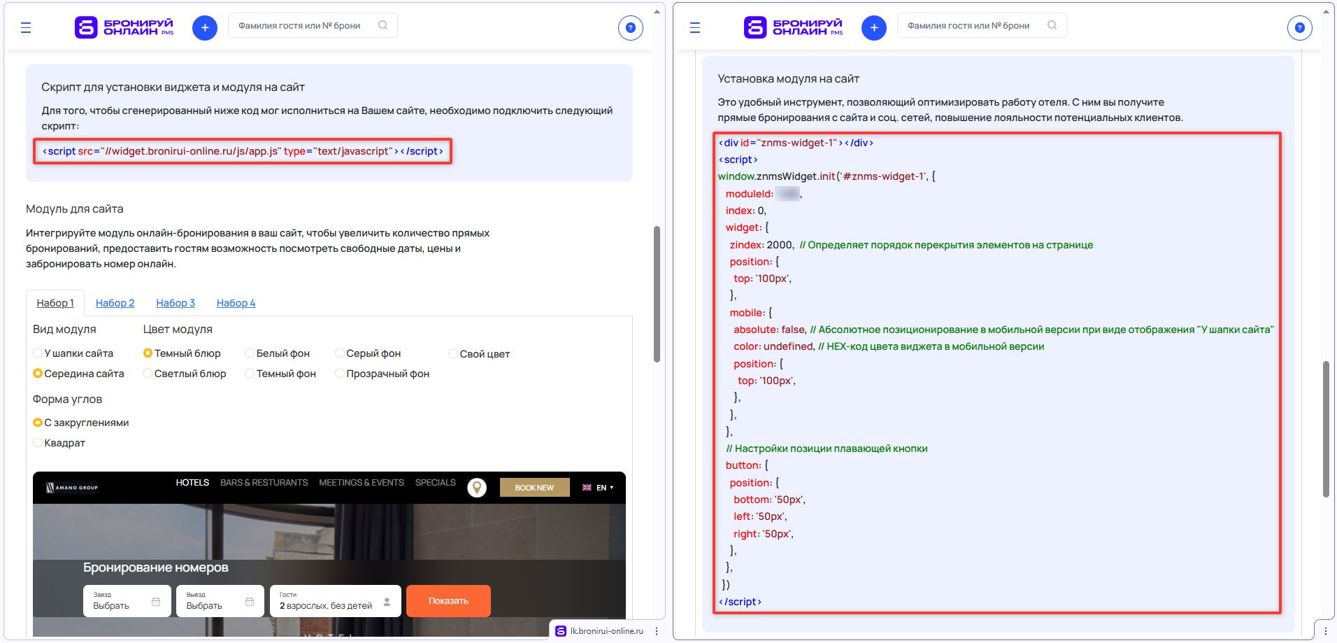 - В личном кабинете «Бронируй Онлайн» скопируйте скрипт вызова модуля и код модуля в разделе «Модуль бронирования» (отркыть в личном кабинете).