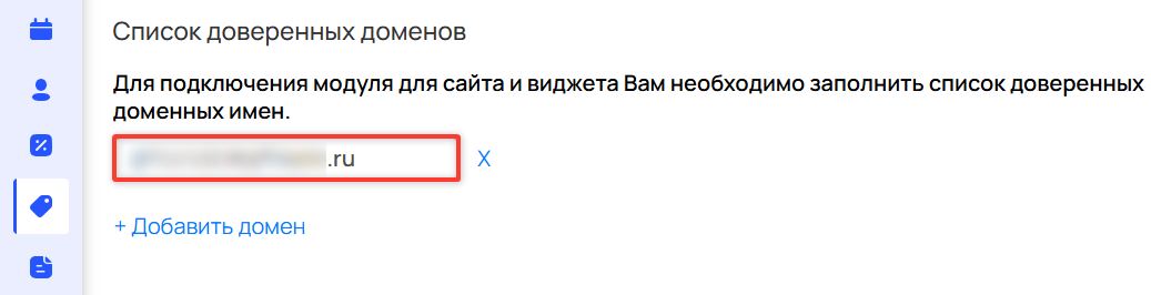 - Добавьте домен вашего сайта в список доверенных в личном кабинете «Бронируй Онлайн» в разделе «Модуль бронирования» (открыть в лично м кабинете).