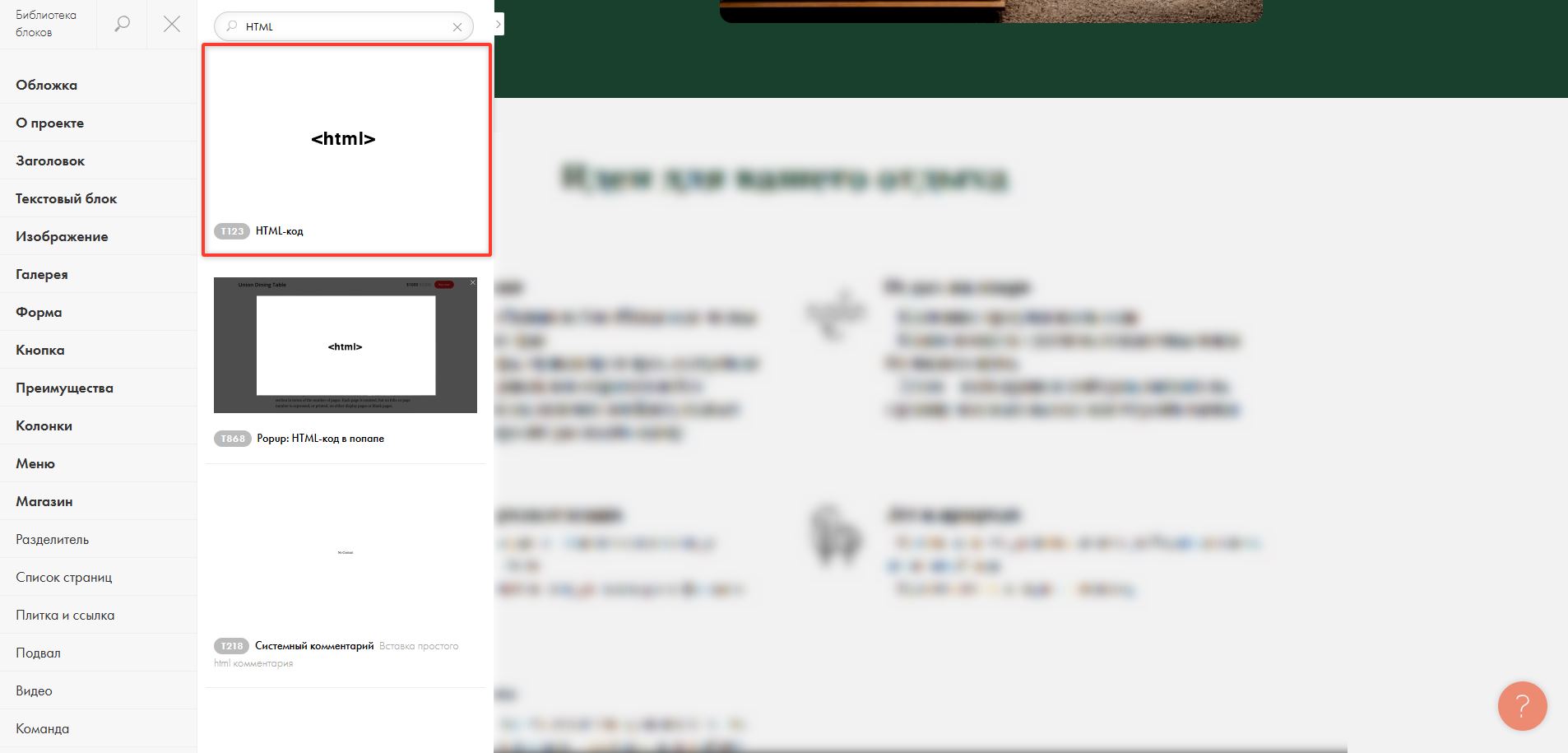 В «Библиотеке блоков» найдите блок T123 «HTML-код». Для нахождения блока перейдите в раздел «Другое» или используйте поле поиска:
