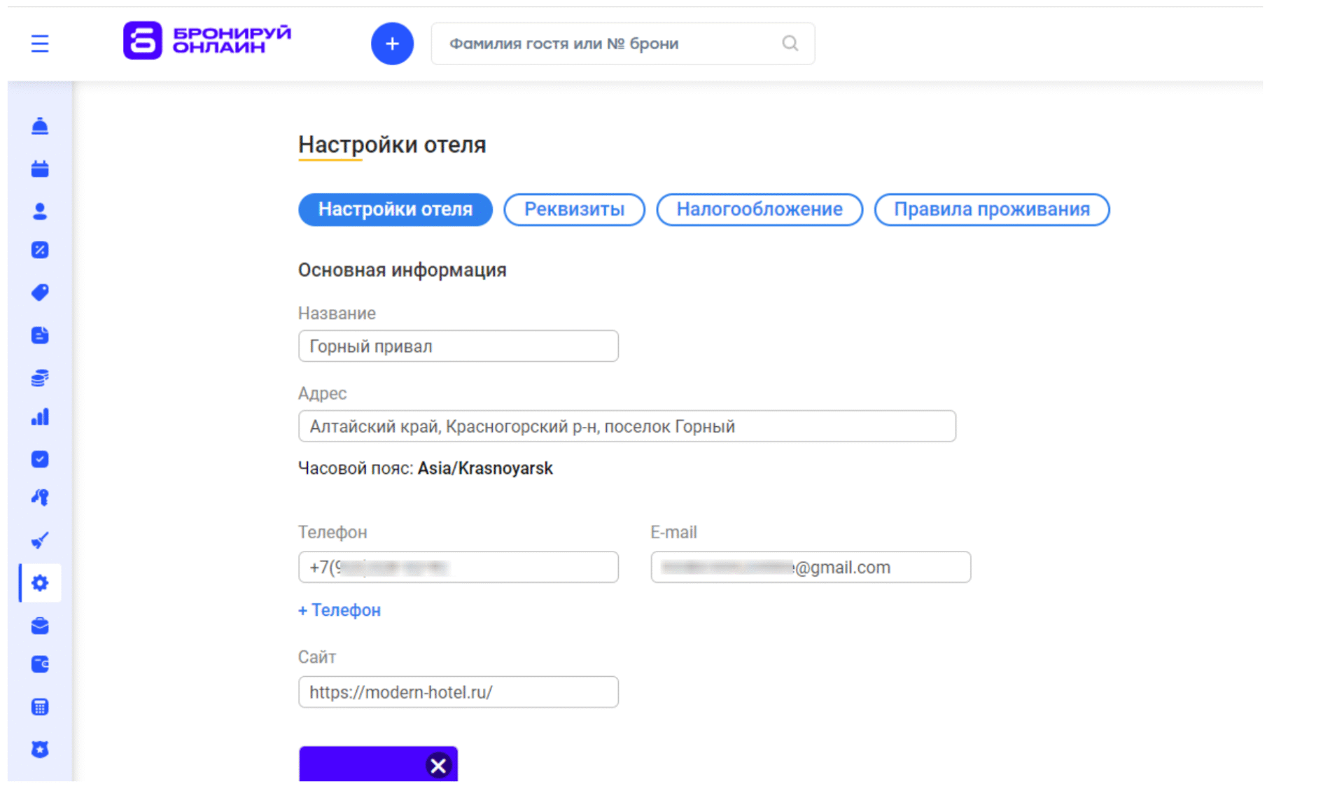 Для старта работы нужно заполнить основные настройки в системе: внести данные об отеле, указать контакты и реквизиты для оплаты.