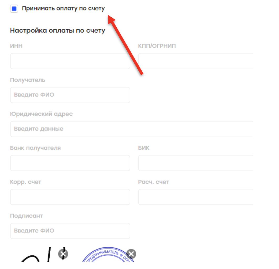 Если вы хотите выставлять гостям счета за бронирование – отметьте опцию «Принимать оплаты по счету» и внесите все необходимые реквизиты. Подгрузите изображение подписи и печати для размещения на бланке счета. Запросить счет при бронировании номера может только юридическое лицо или ИП.