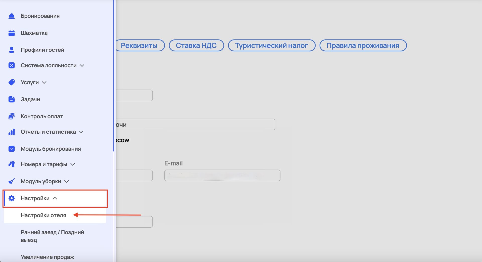 В левом меню откройте раздел «Настройки» → «Настройки отеля» (открыть в личном кабинете).