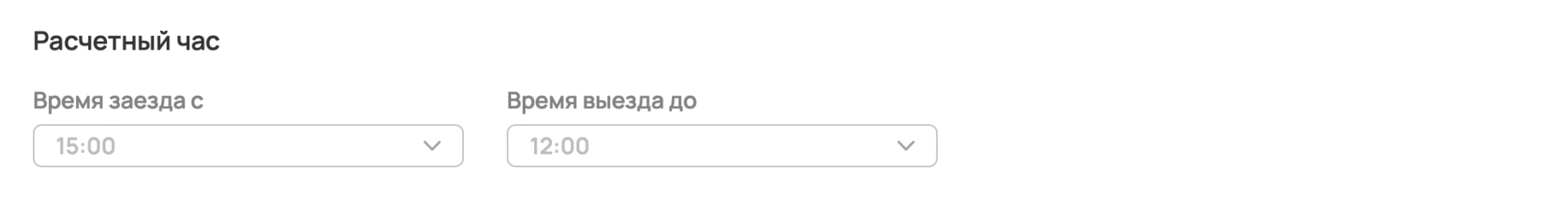 Ниже необходимо ввести расчетный час, который будет применяться в вашем объекте размещения. В соответствующих полях нужно выбрать отдельно время заезда и время выезда.