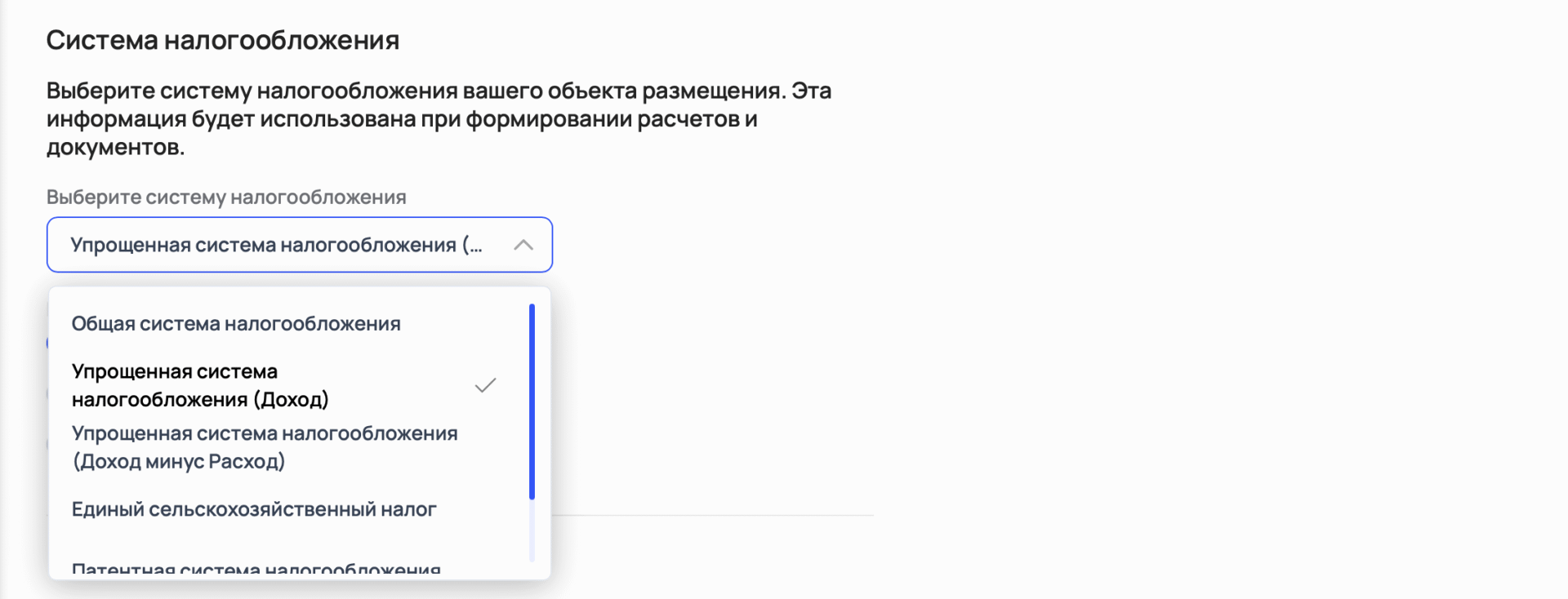 Выберите систему налогообложения вашего объекта размещения. В списке представлены самые актуальные варианты.