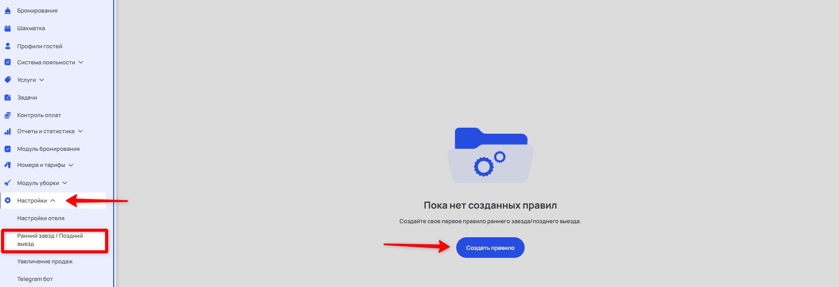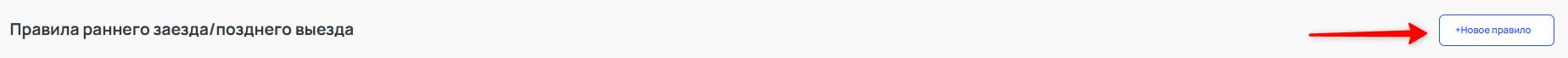Чтобы создать правило перейдите в раздел «Настройки» → «Ранний заезд / Поздний выезд» (открыть в личном кабинете) и нажмите кнопку «Создать правило».