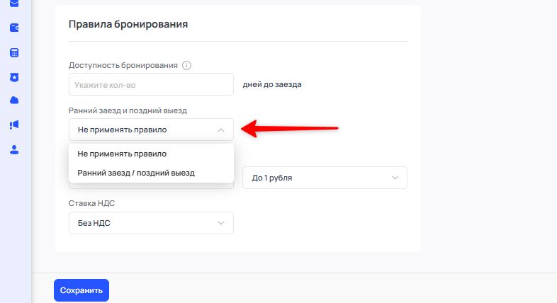 После создания правила, его необходимо привязать к тарифу. Для этого перейдите в раздел «Номера и тарифы» → «Тарифы» (открыть в личном кабинете), нажмите на название тарифа и в блоке «Правила бронирования» в поле «Ранний заезд и поздний выезд» выберите созданное правило в выпадающем списке. Затем сохраните изменения.