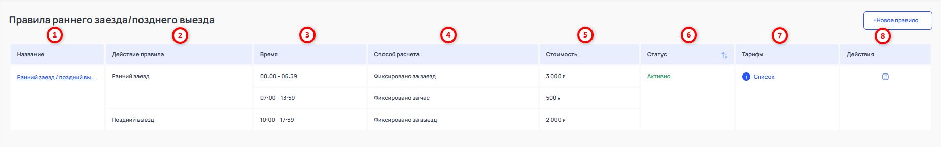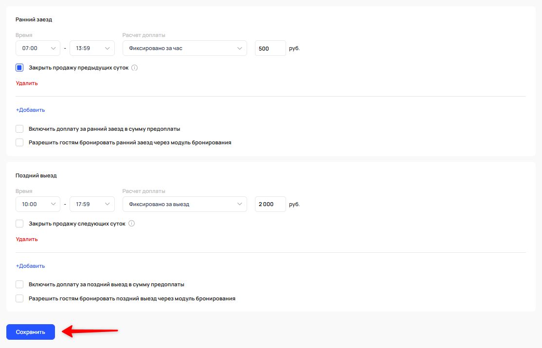 Вы можете настроить ранний заезд и поздний выезд в рамках одного правила или разделить их на несколько.