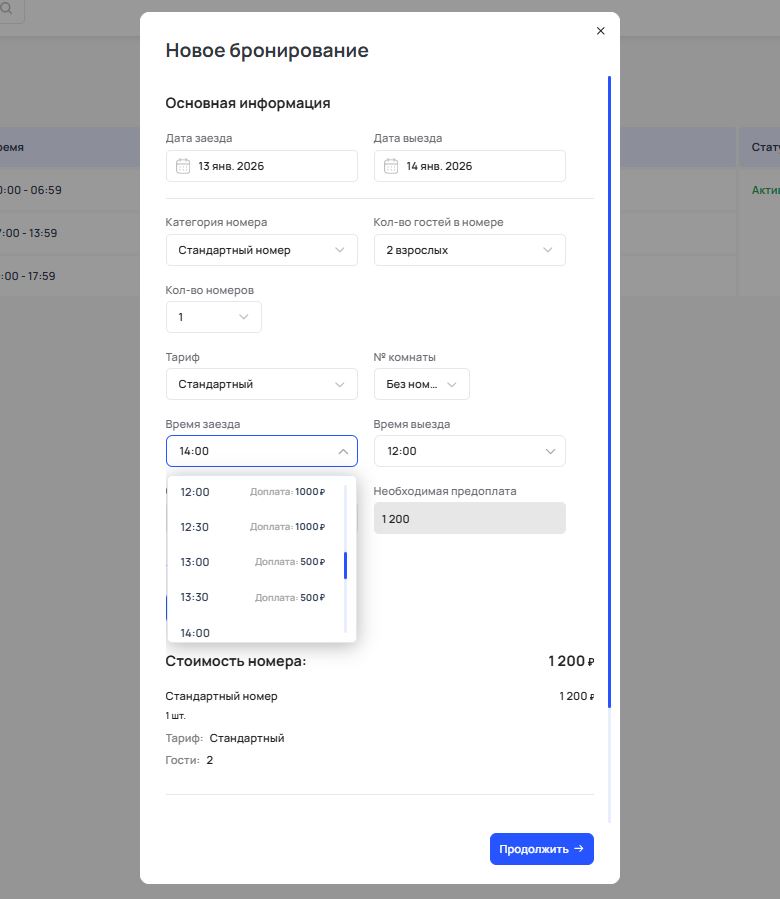 При настроенном правиле во время выбора времени заезда или выезда вы сразу увидите необходимую доплату, которая автоматически будет добавлена к стоимости брони.