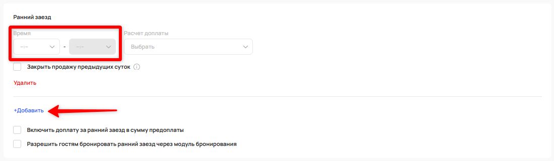 - Укажите временной период, в течение которого сможете встретить гостя. Можно добавить несколько периодов и указать для них разную доплату. Для этого нажмите на кнопку «+Добавить» и укажите новые условия. Временные интервалы не должны пересекаться.