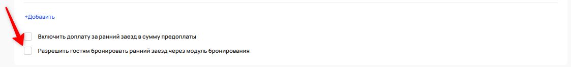 - Отметьте пункт «Разрешить гостям бронировать ранний заезд через модуль бронирования», если хотите дать гостям возможность резервировать ранний заезд самостоятельно, при оформлении брони.