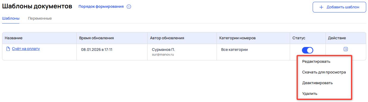 • Меню действий (редактирование, скачивание, деактивация, удаление).