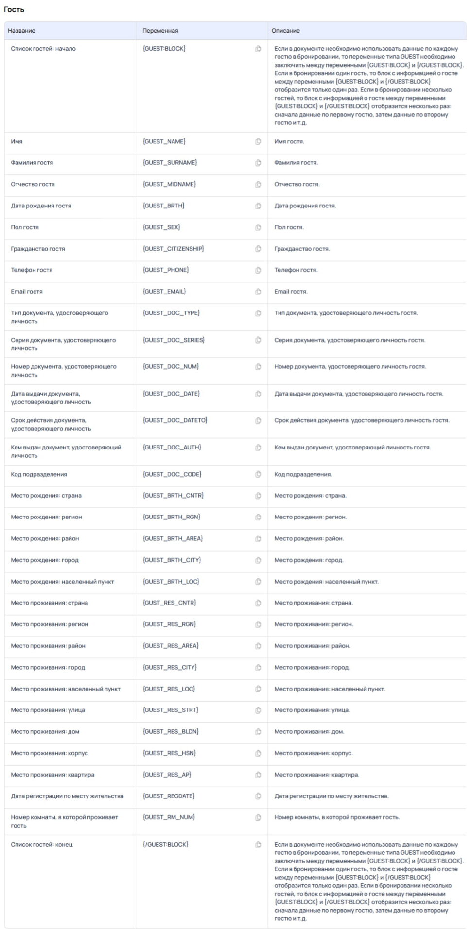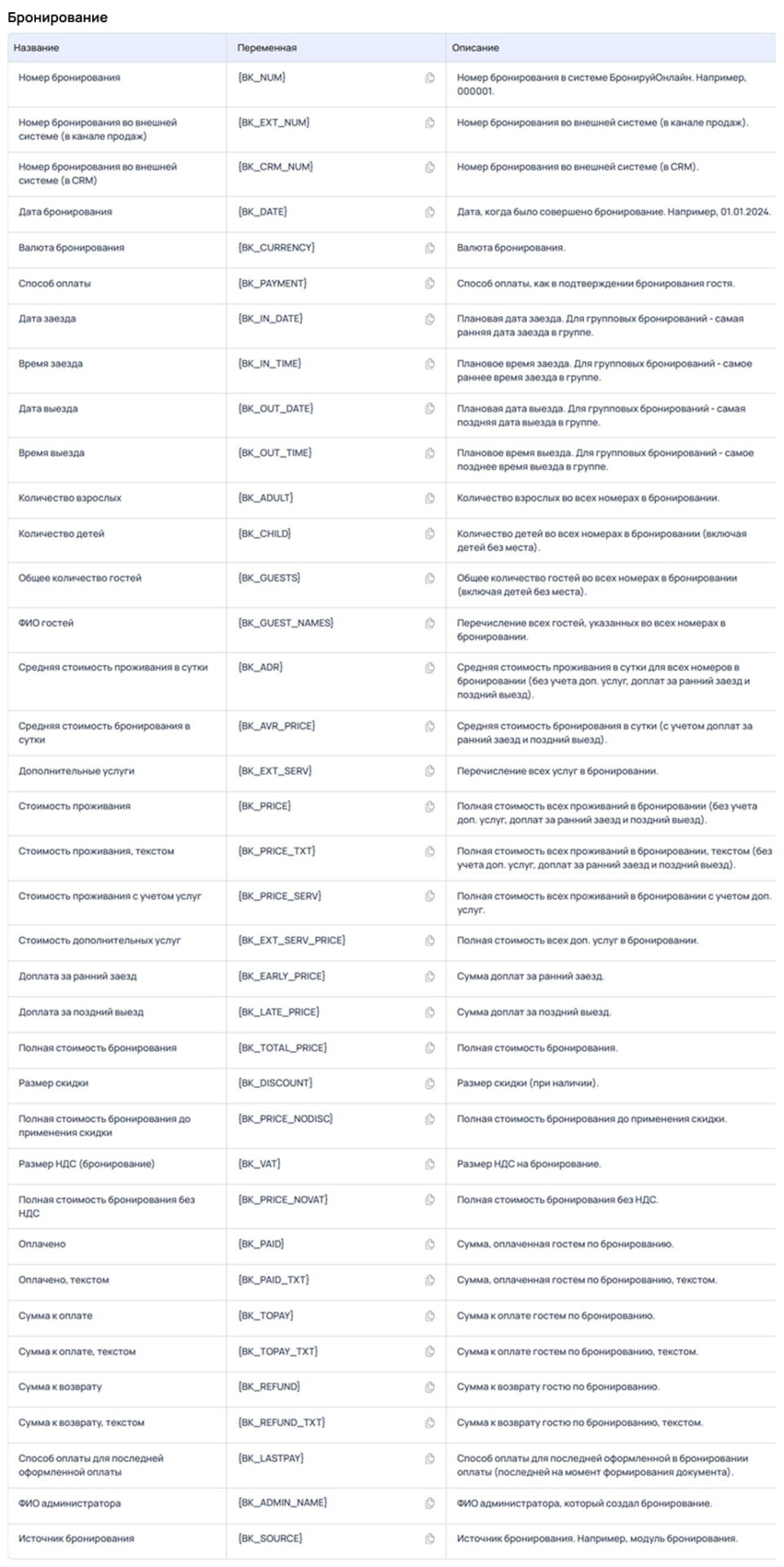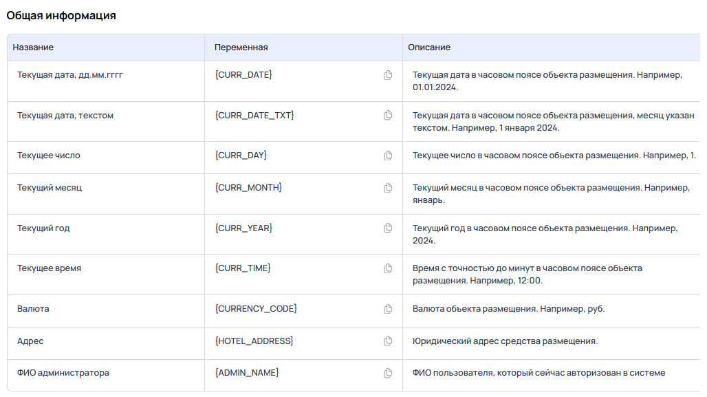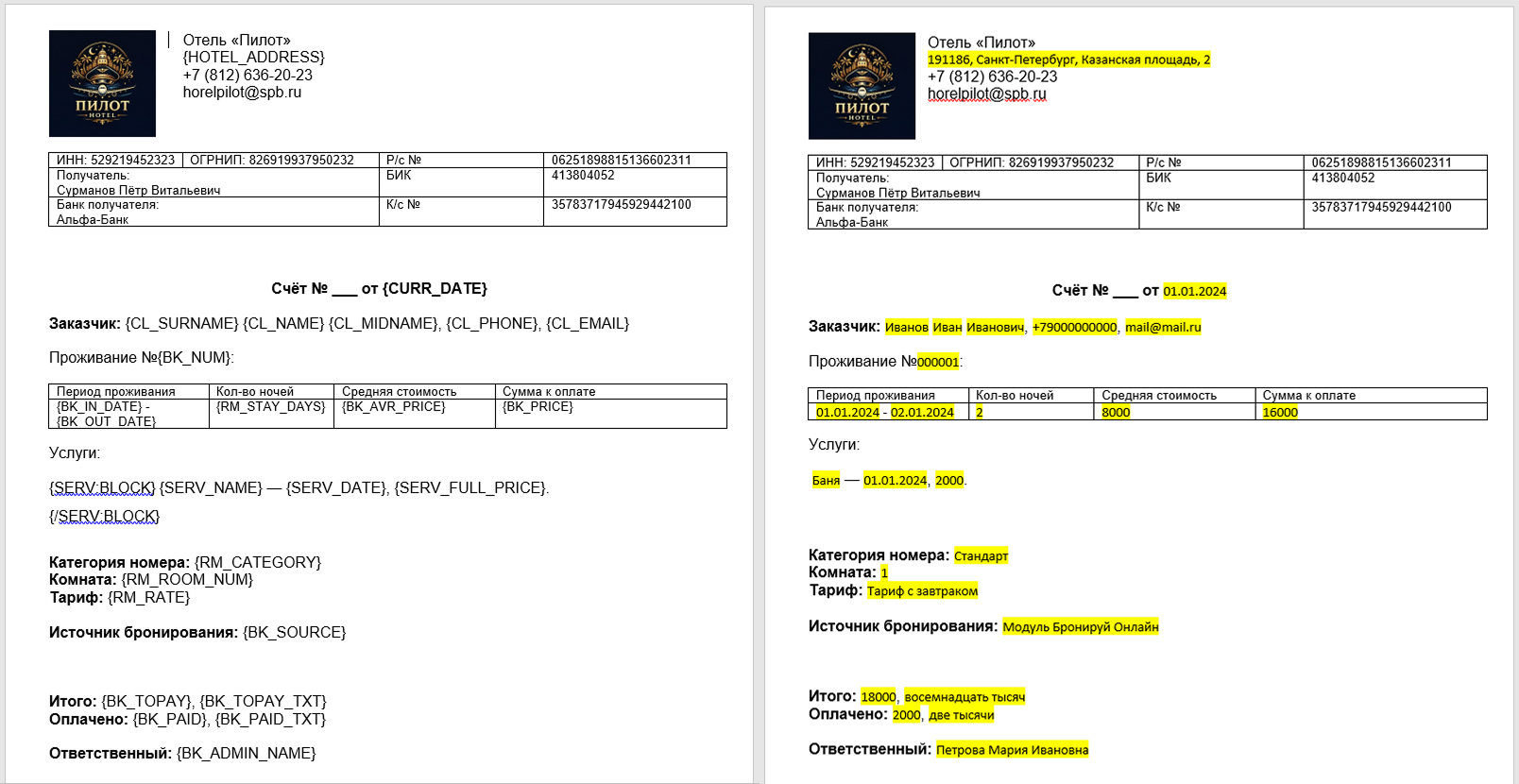 С помощью этого инструмента можно создавать шаблоны, которые автоматически подгружают данные на основе информации в личном кабинете: в карточках бронирования, настройках отеля, параметров НДС и других разделах.