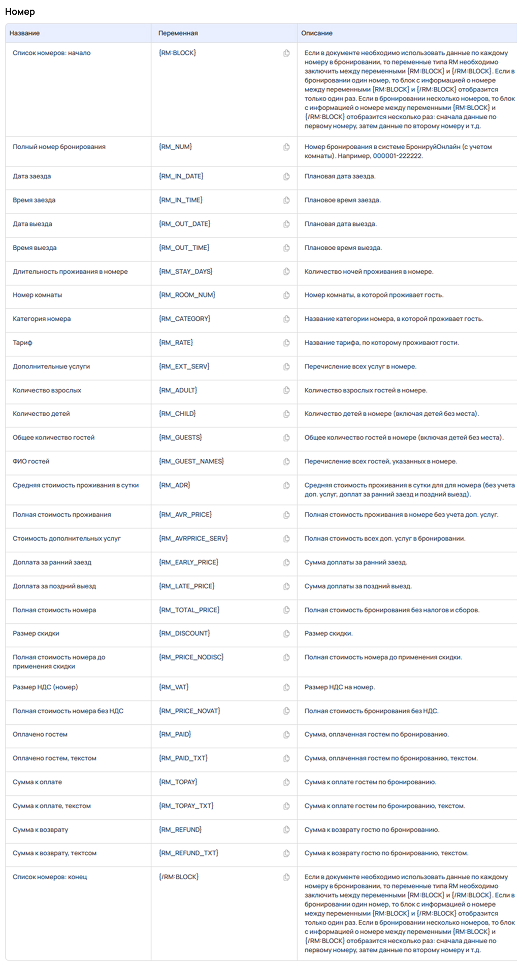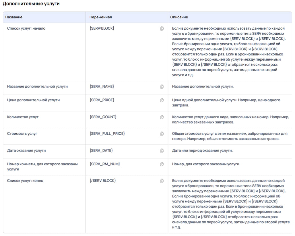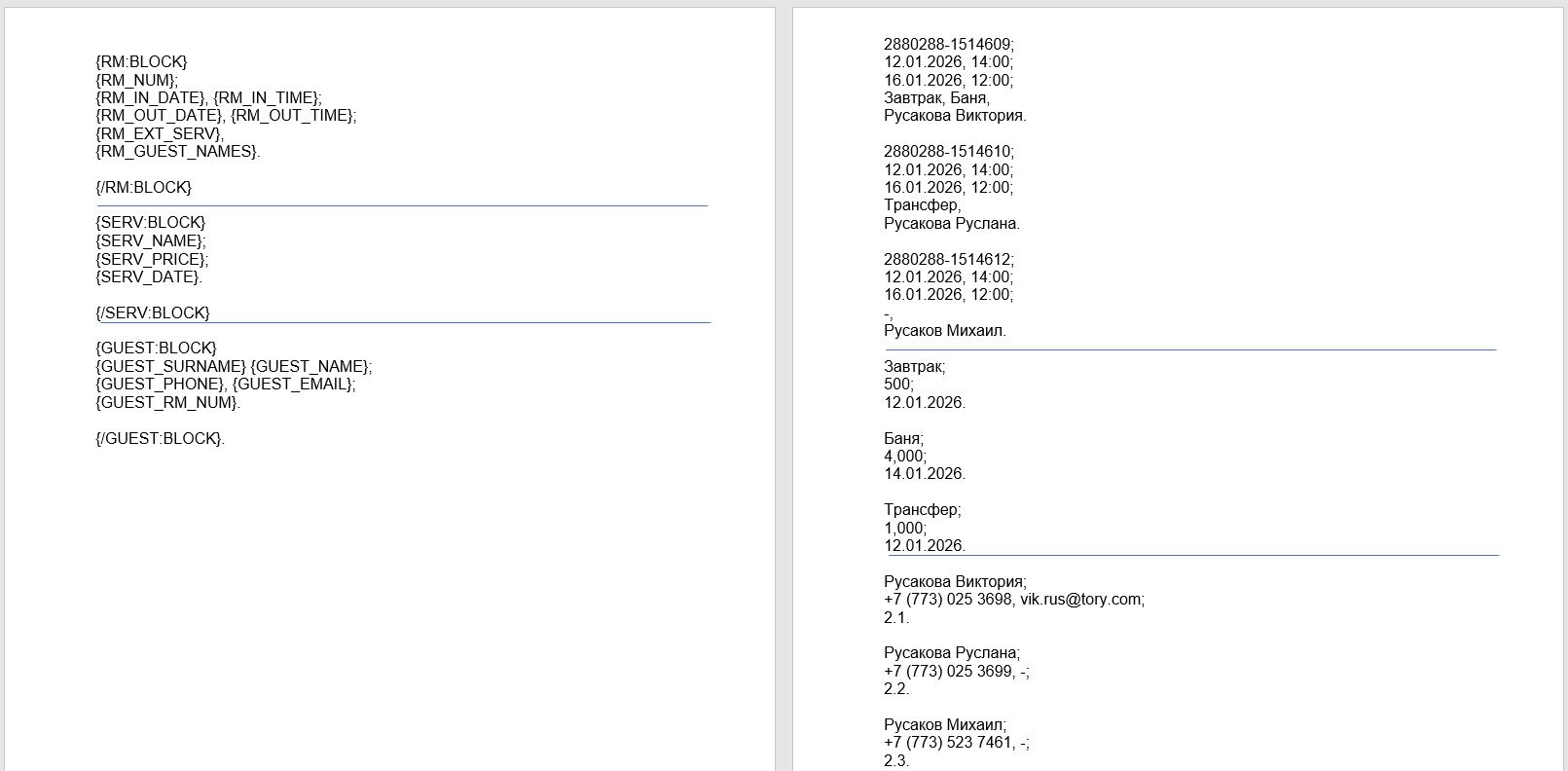 С помощью этого инструмента можно создавать шаблоны, которые автоматически подгружают данные на основе информации в личном кабинете: в карточках бронирования, настройках отеля, параметров НДС и других разделах.