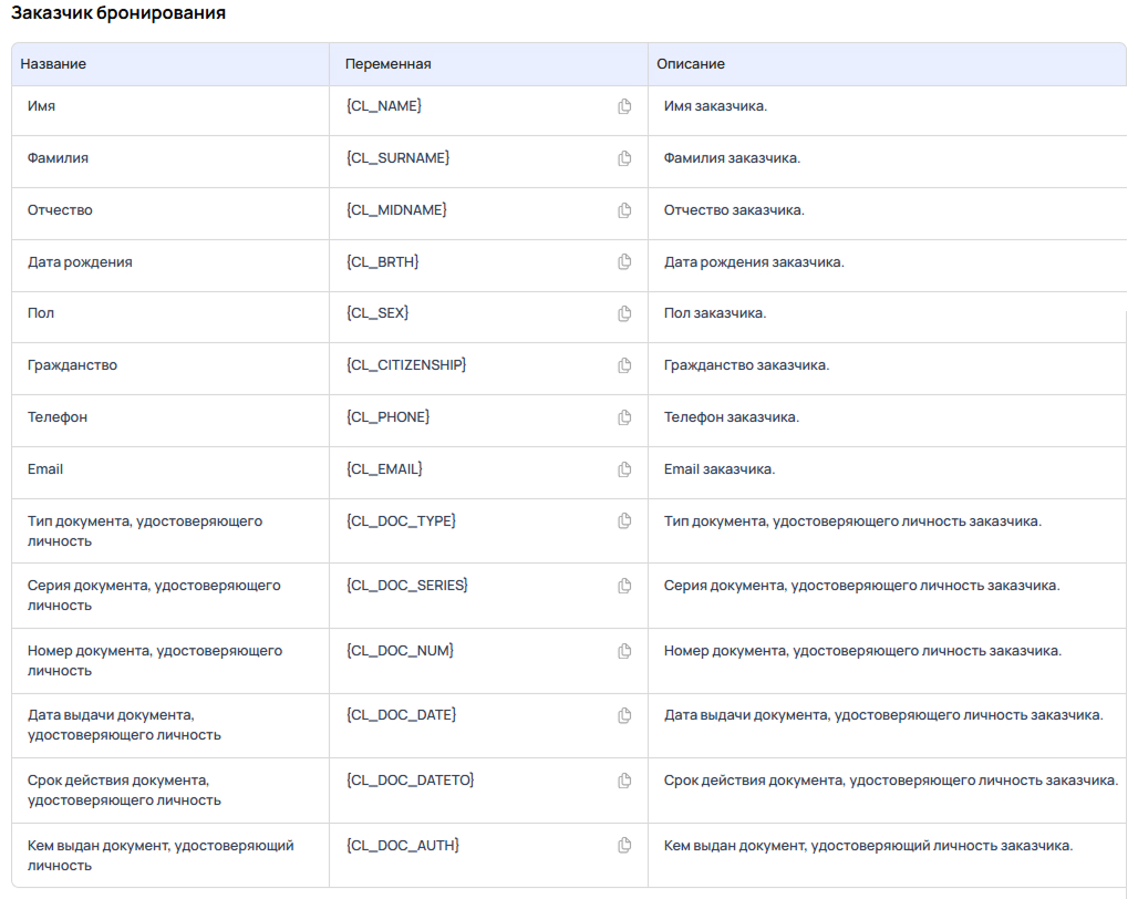 • Заказчик бронирования. Содержит переменные ФИО, даты рождения, контактов, пола и гражданства, информации об удостоверении личности.