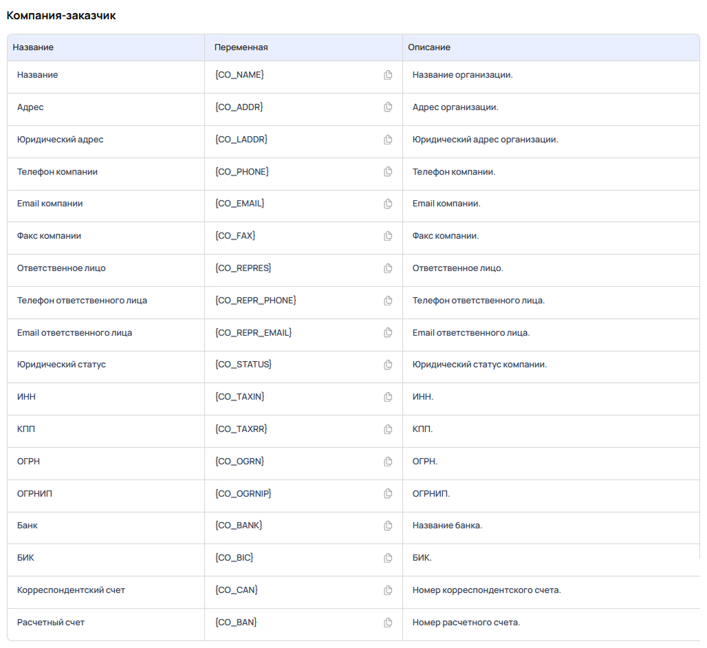 • Компания-заказчик. Содержит переменные контактов, данных ответственного лица, реквизитов.