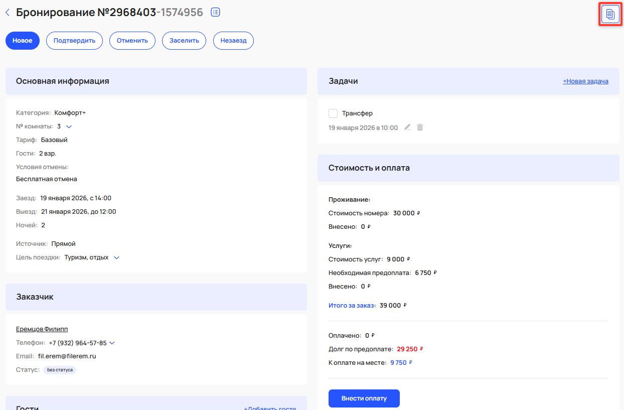 Перейдите в карточку бронирования и нажмите на иконку документов.