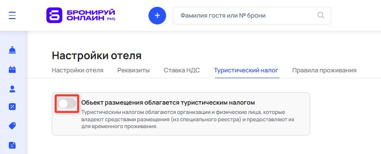 Для начала сбора информации по туристическому налогу перейдите в раздел «Настройки» → «Настройки отеля» → «Туристический налог» (открыть в личном кабинете) и активируйте ползунок в блоке «Объект размещения облагается туристическим налогом».