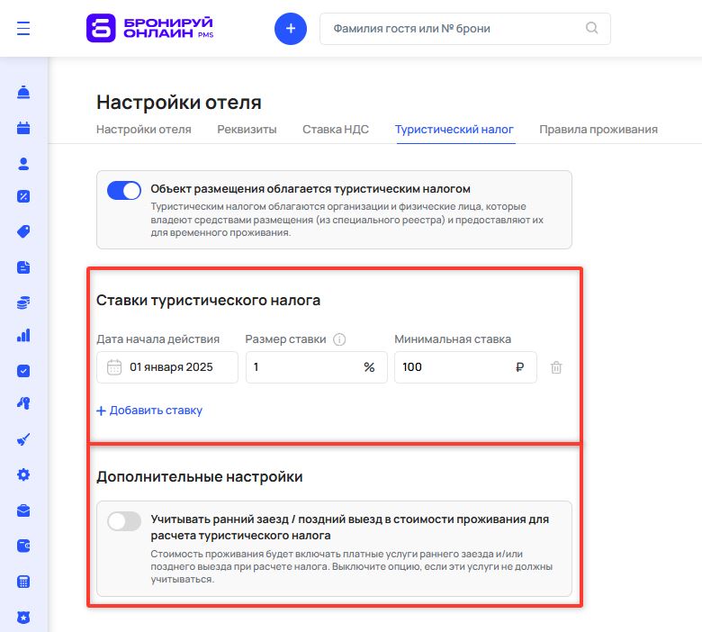 После активации на странице отобразится блок «Ставки туристического налога», а также появится возможность включить учет раннего заезда и позднего выезда для расчета налога.