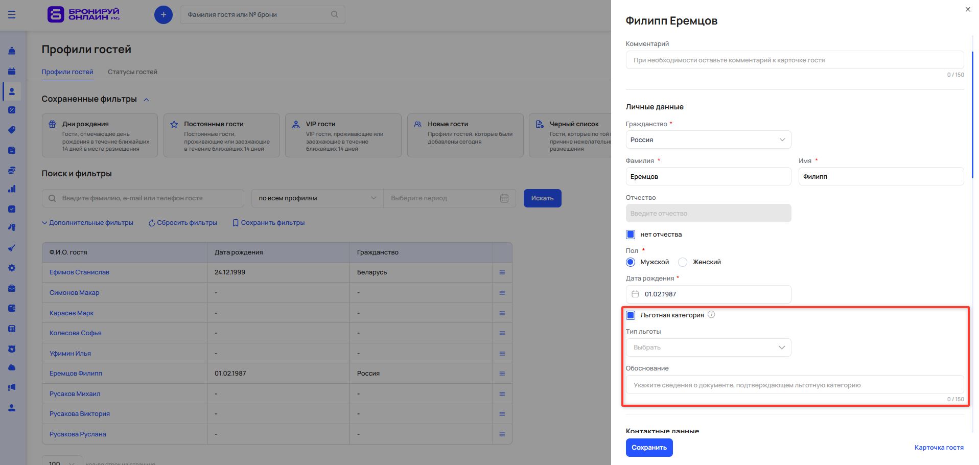 После активации настроек в анкете гостя появится возможность указать наличие льготной категории, ее тип и обоснование. Доступны два типа льготы: местная и федеральная.