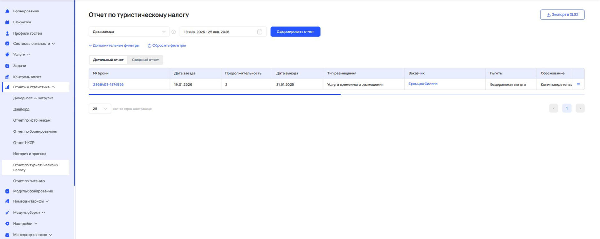 В разделе «Отчеты и статистика» становится доступен отчет по туристическому налогу (открыть в личном кабинете).