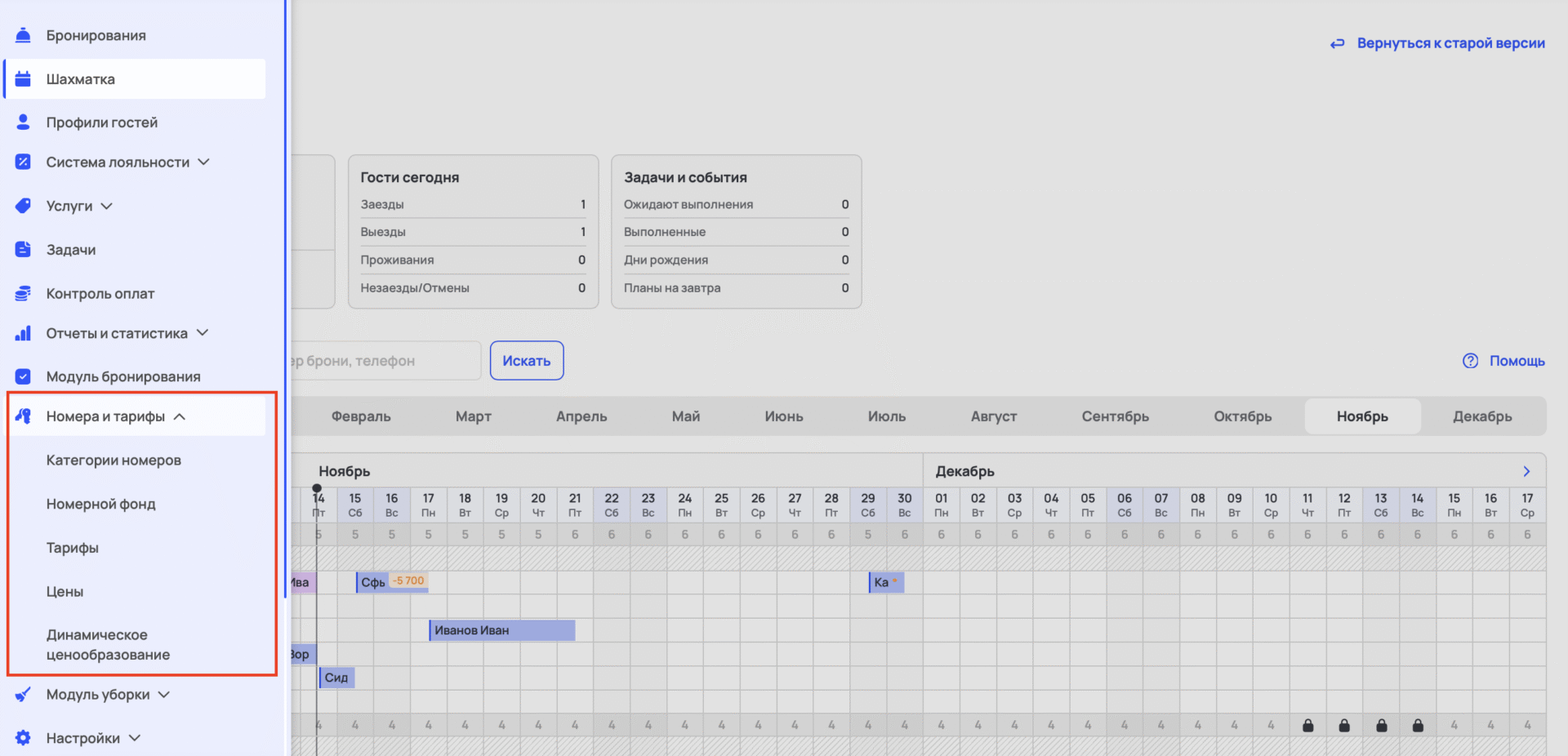 Для начала работы нужно корректно заполнить всю необходимую информацию в основных разделах: «Категории номеров», «Номерной фонд», «Тарифы» и «Цены». Разделы заполняются в той последовательности, в которое они расположены в меню.