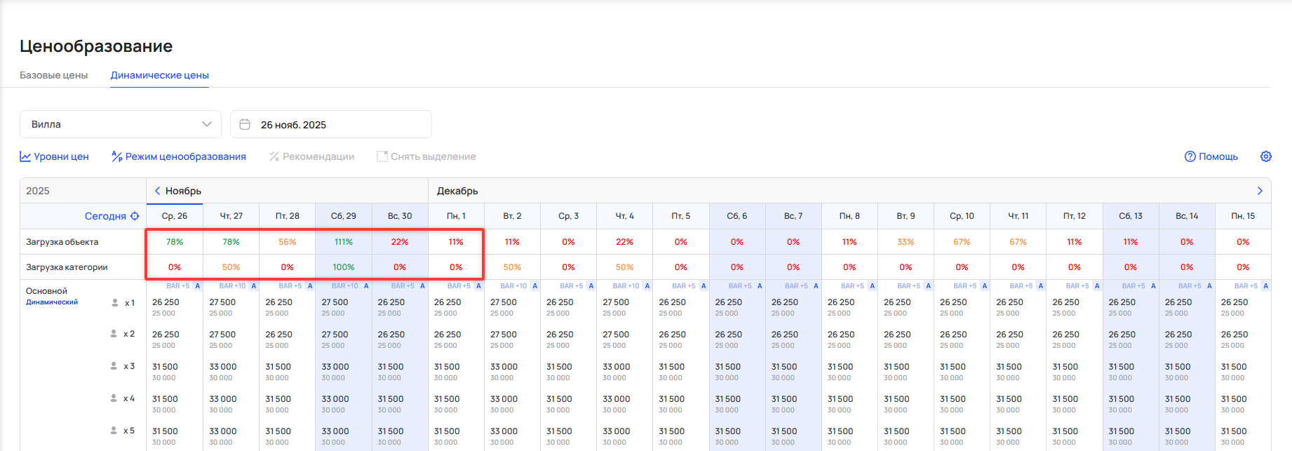 Под каждой датой отображается загрузка всего объекта и выбранной категории.