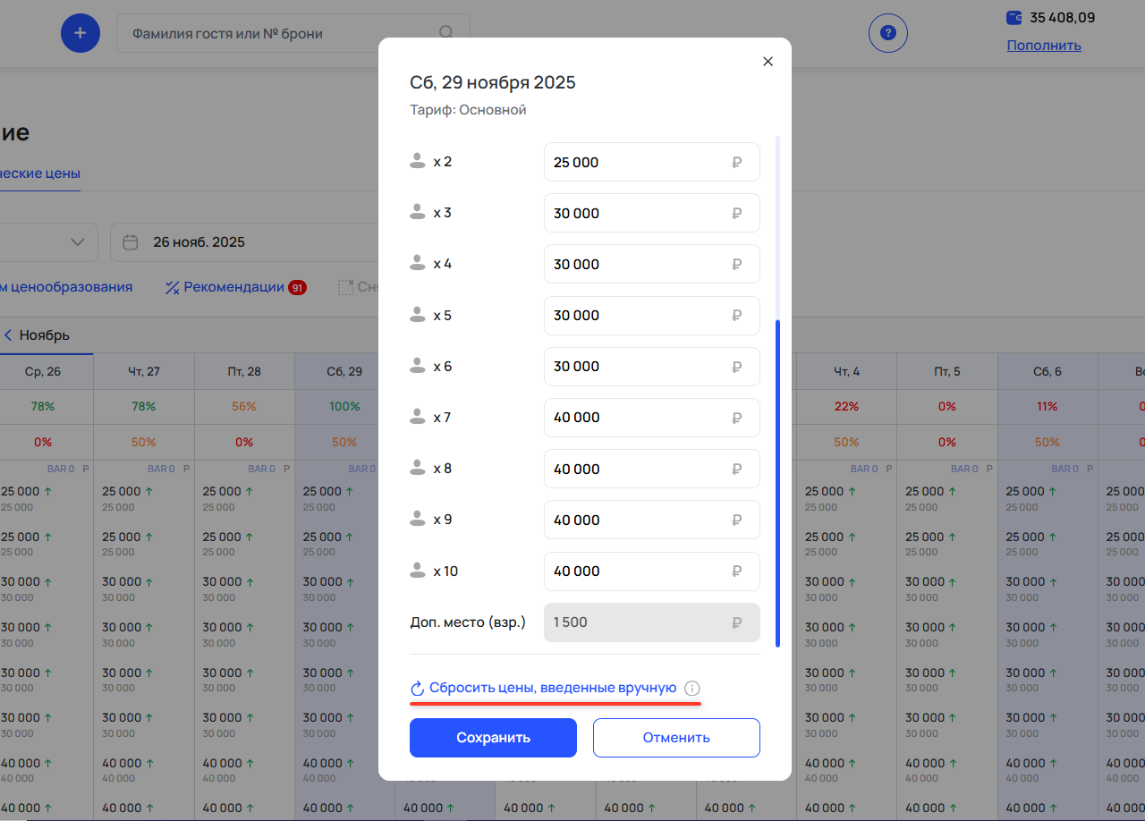 По нажатию на ячейку открывается окно настроек для выбранной даты и тарифа.