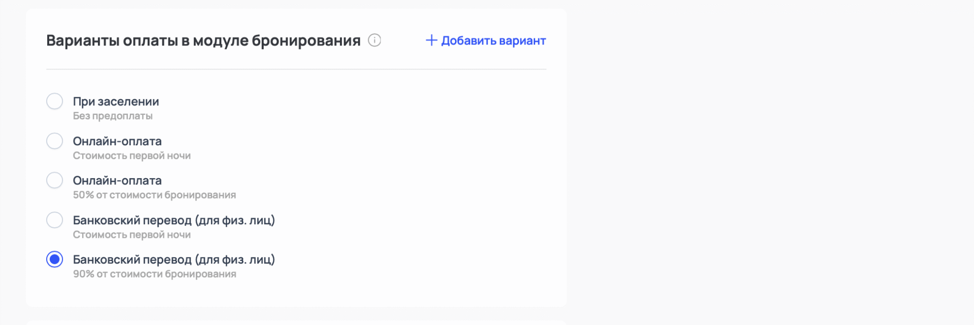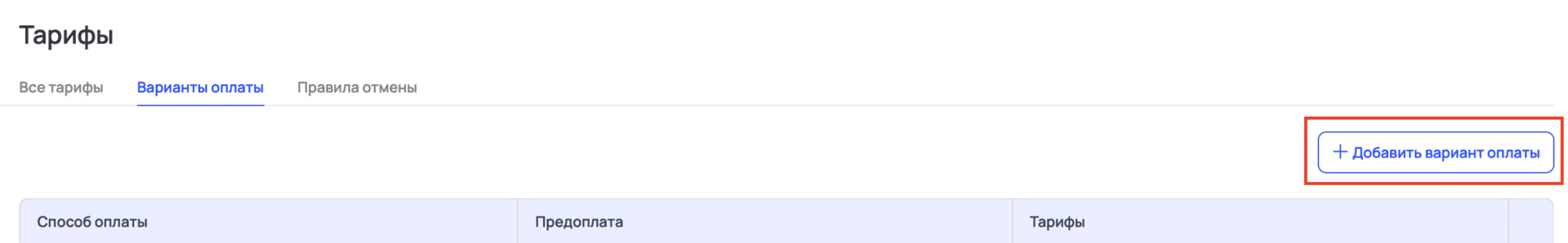 Чтобы завести новый вариант оплаты, нажмите на кнопку «+Добавить вариант оплаты» в правой части экрана.