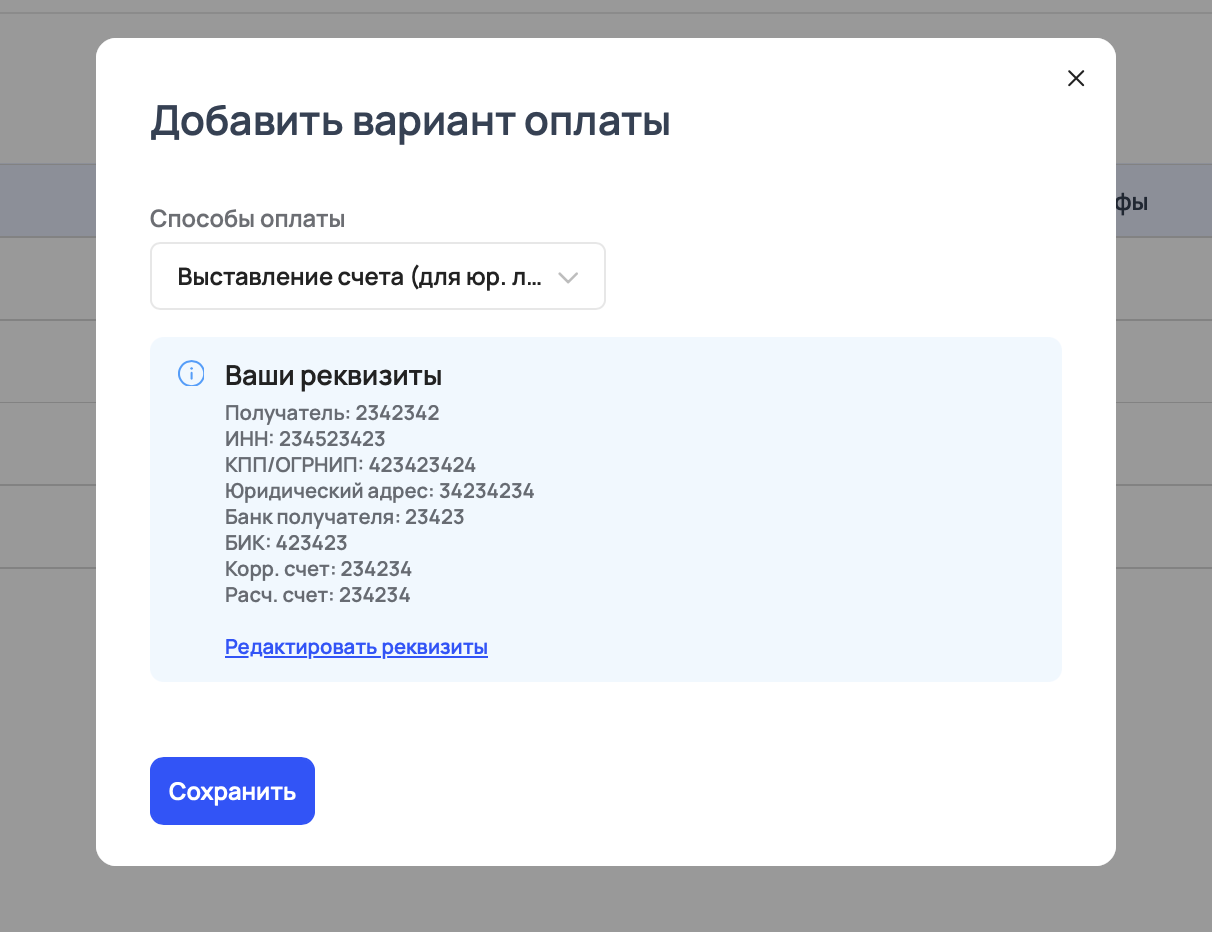 Вы также можете создать несколько типов оплаты банковским переводом с разными условиями предоплаты, чтобы включить их в разные тарифы.