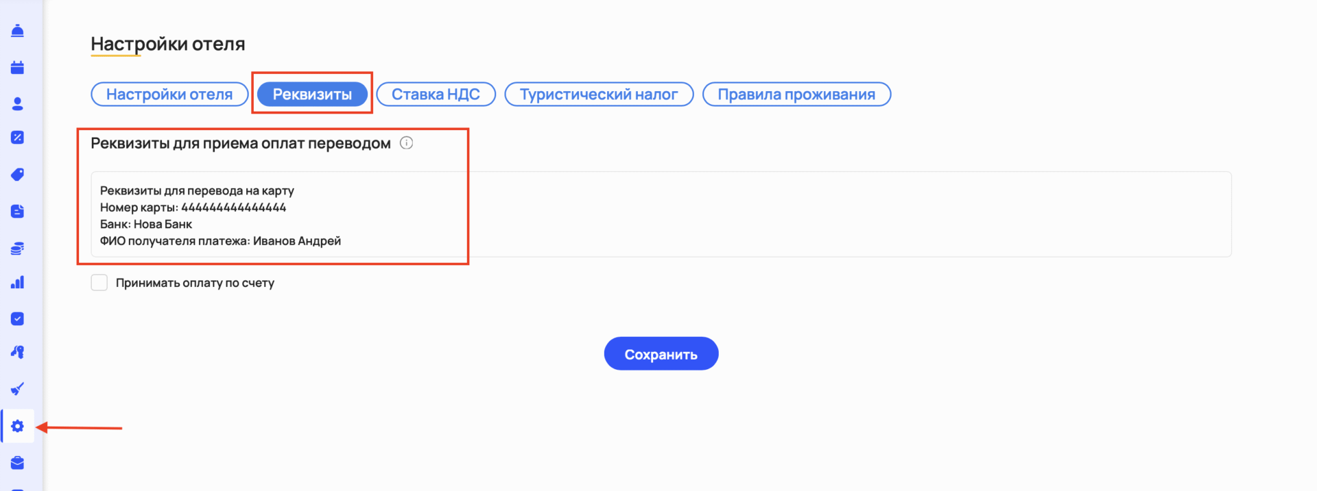 Далее перейдите в раздел системы «Настройки»«Настройки отеля»«Реквизиты» (открыть в личном кабинете) и вставьте скопированную строчку кода в поле «Реквизиты для приема оплат переводом».