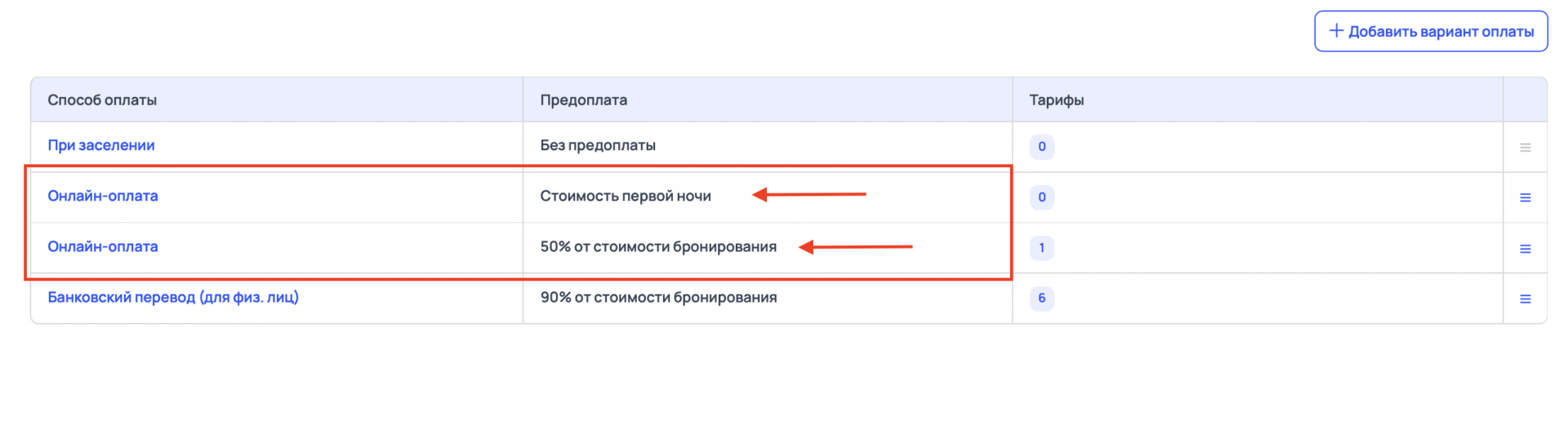 При необходимости вы сможете настроить параметры предоплаты и сделать несколько способов онлайн-оплаты с разными настройками предоплаты для разных тарифов.