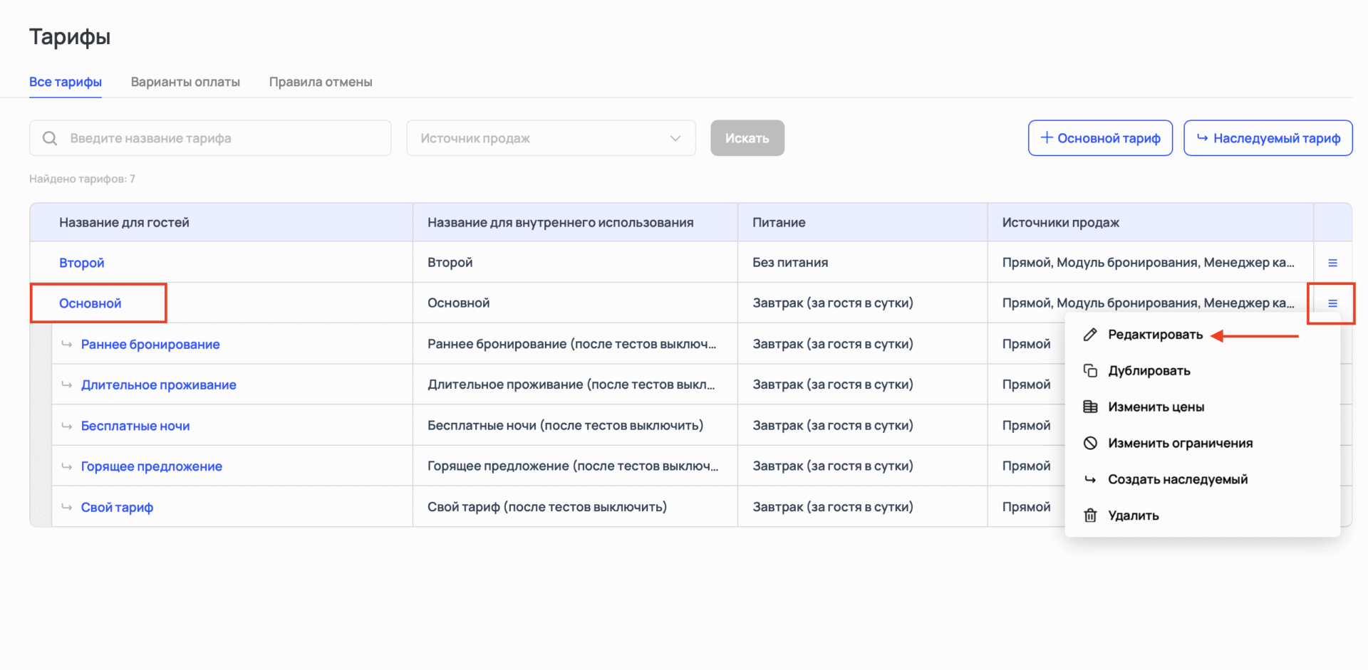 Выберите нужный тариф из списка и зайдите в его настройки, щелкнув на название или выбрав вариант «Редактировать» через кнопку опций в правом столбце.