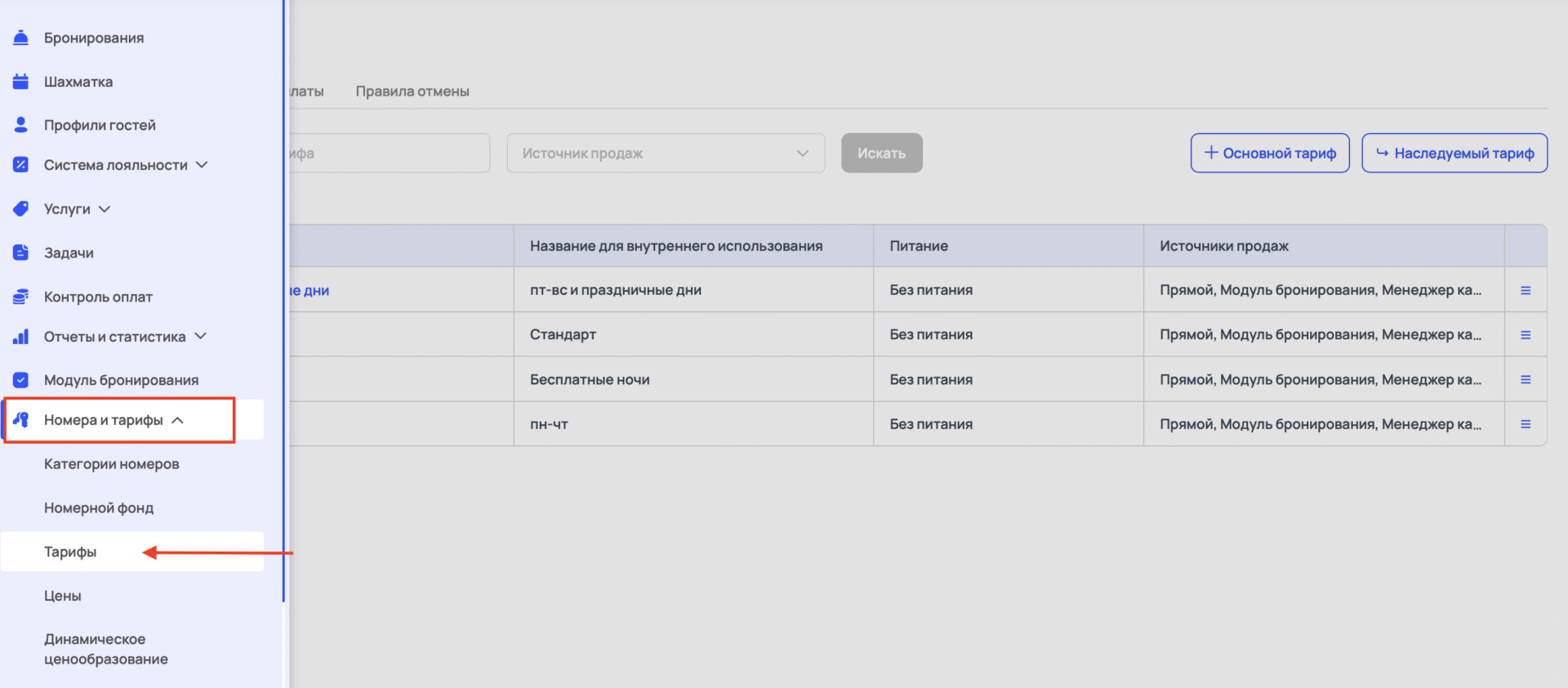 Когда в настройках услуги будут отмечены нужные тарифы, можно будет привязать услуги к тарифам. Для этого перейдите в меню управления тарифами: «Номера и тарифы»«Тарифы» в левом командном меню (открыть в личном кабинете).
