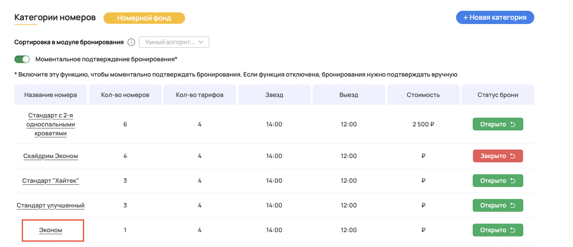 Для этого перейдите в раздел «Номера и тарифы» → «Категории номеров» в левом боковом меню (открыть в личном кабинете).