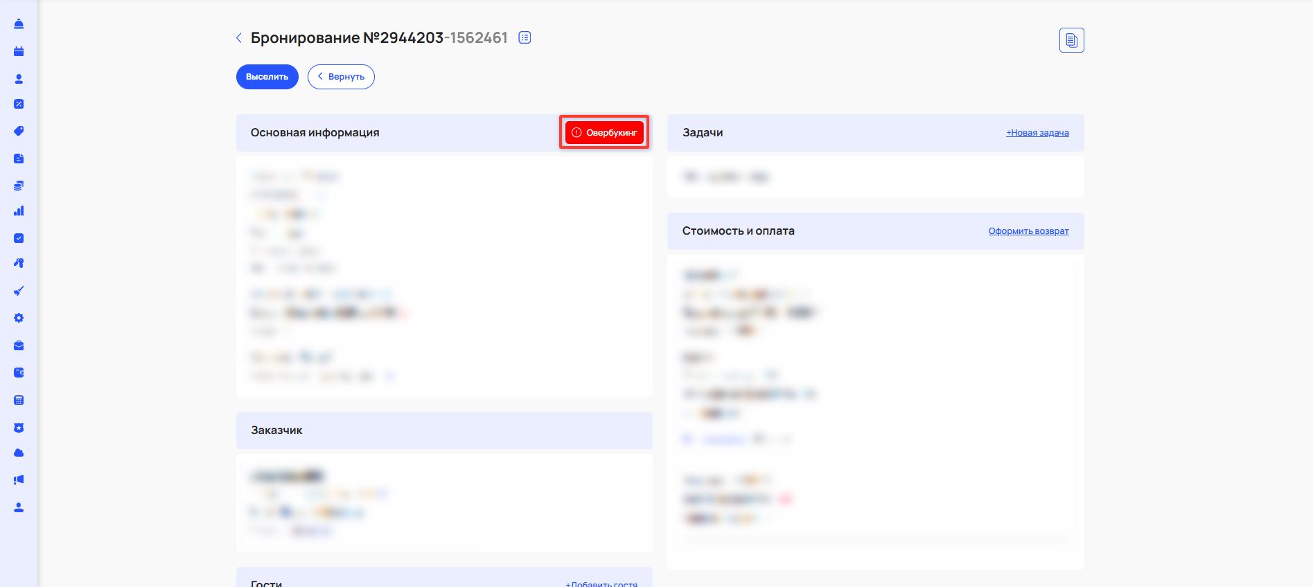 При выселении позже стандартного времени система предупреждит: «Внимание! Вы выселяете гостя позже указанного времени». У вас будет возможность выбрать время выезда, в том числе стандартное, указать наличие доплаты за поздний выезд и ее размер.