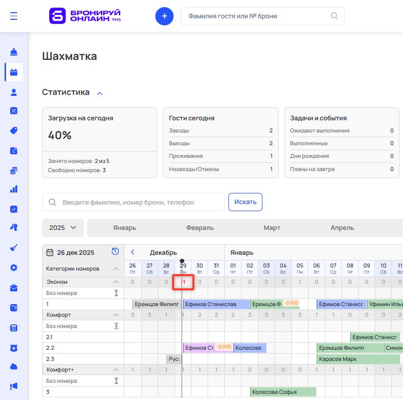 При наложения бронирований и отсутствии доступных номеров той же категории вы увидите в шахматке отрицательное значение квоты (доступности) напротив названия категории номера.