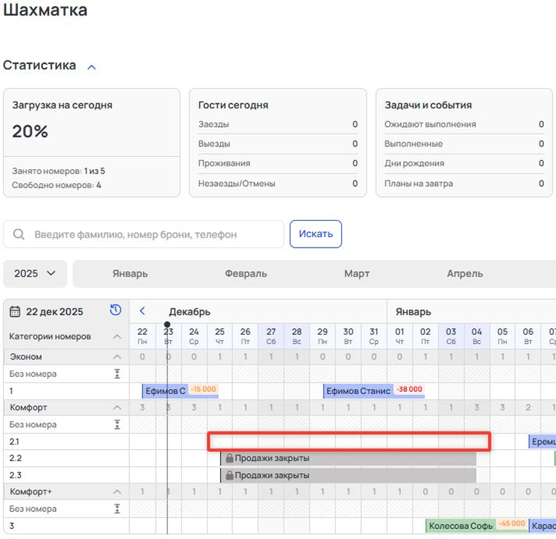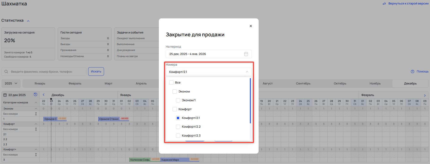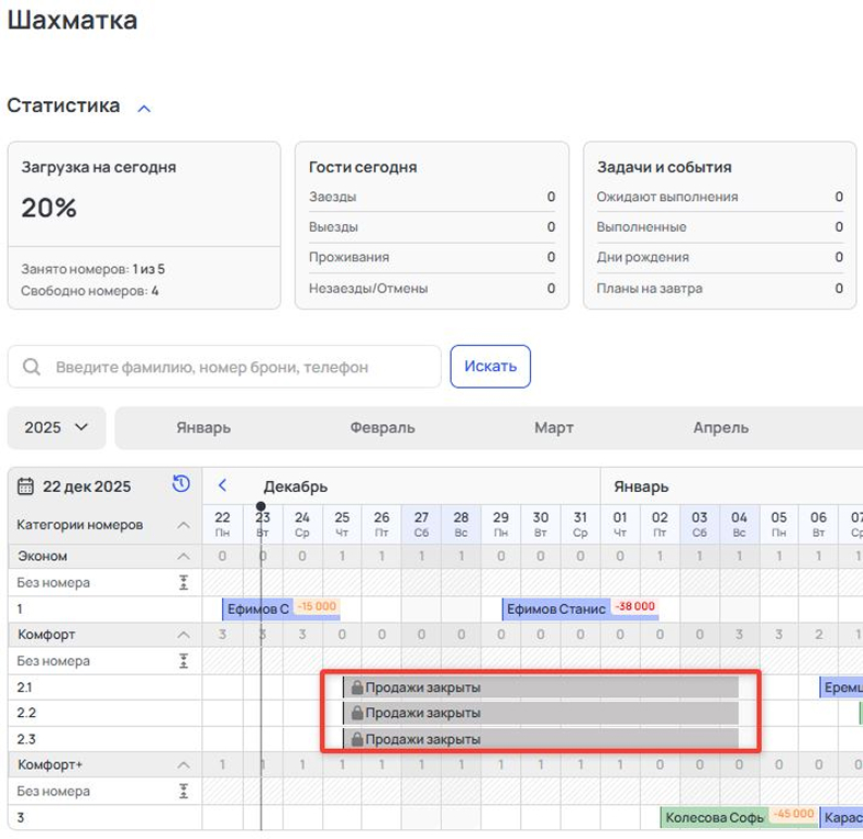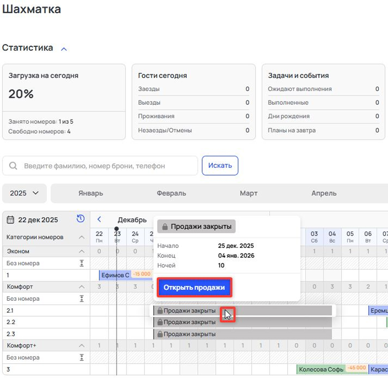 После этого выбранный номер на конкретный период отобразится закрытым для продаж.