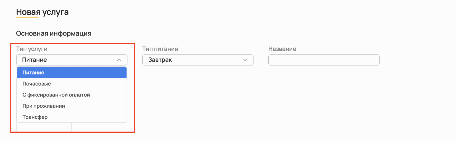 Во втором выпадающем списке необходимо выбрать тип питания: завтрак, обед, ужин, полупансион или полный пансион. Эти типы питания встроены в систему по умолчанию и соответствуют стандартам предоставления гостиничных услуг.