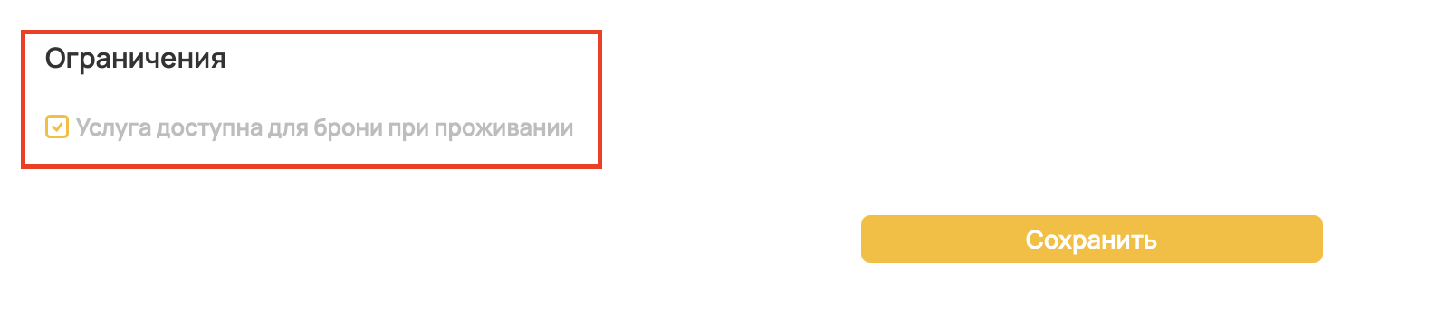 • Если вы планируете предлагать созданную услугу питания к покупке в модуле бронирования номера, необходимо проставить галочку в строке «Услуга доступна для брони при проживании».