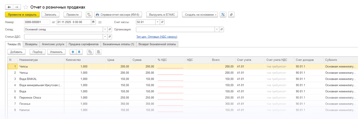 Наличные платежи и платежи банковской картой, оформленные в шахматке